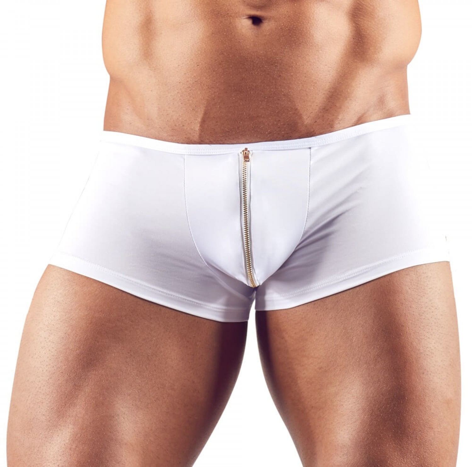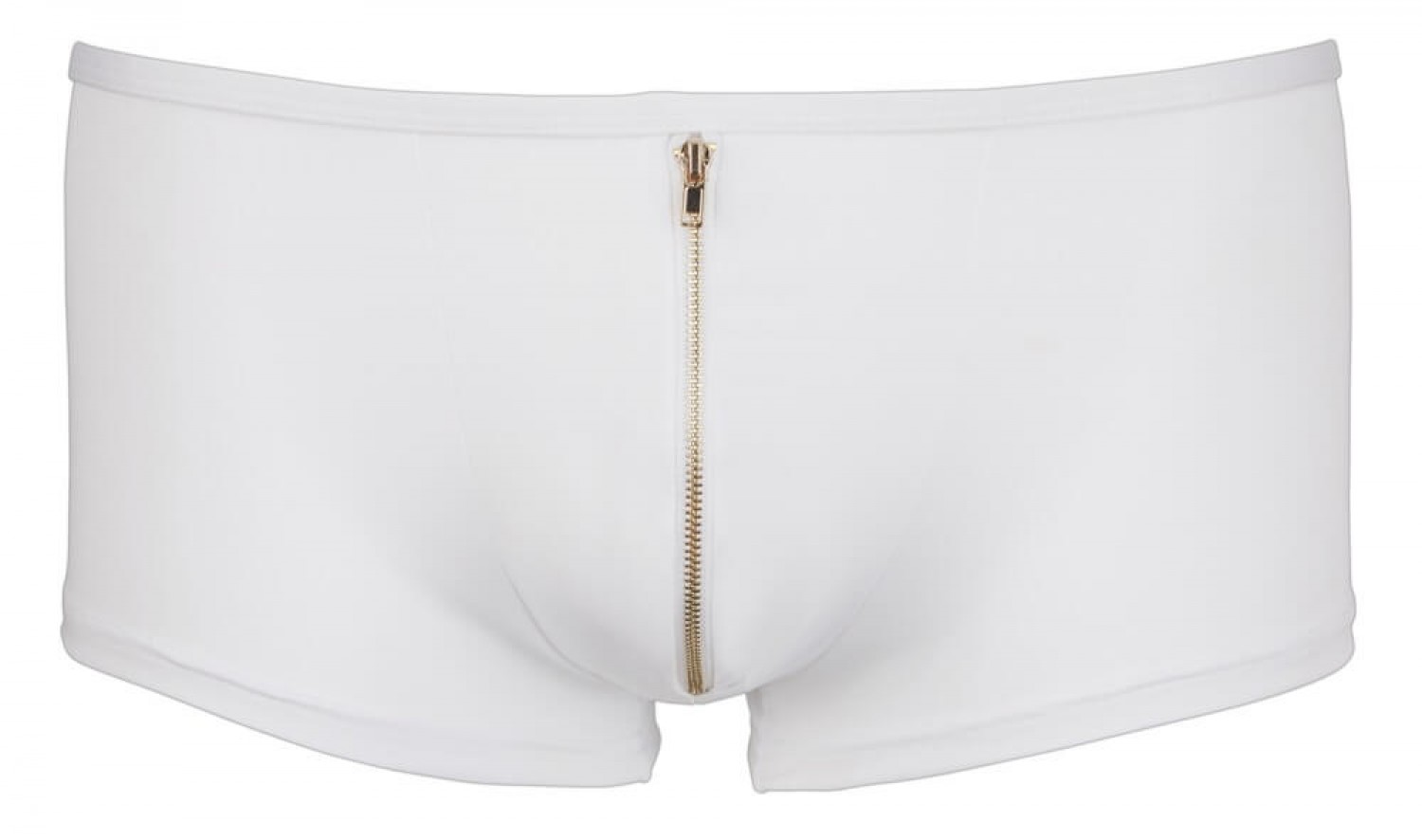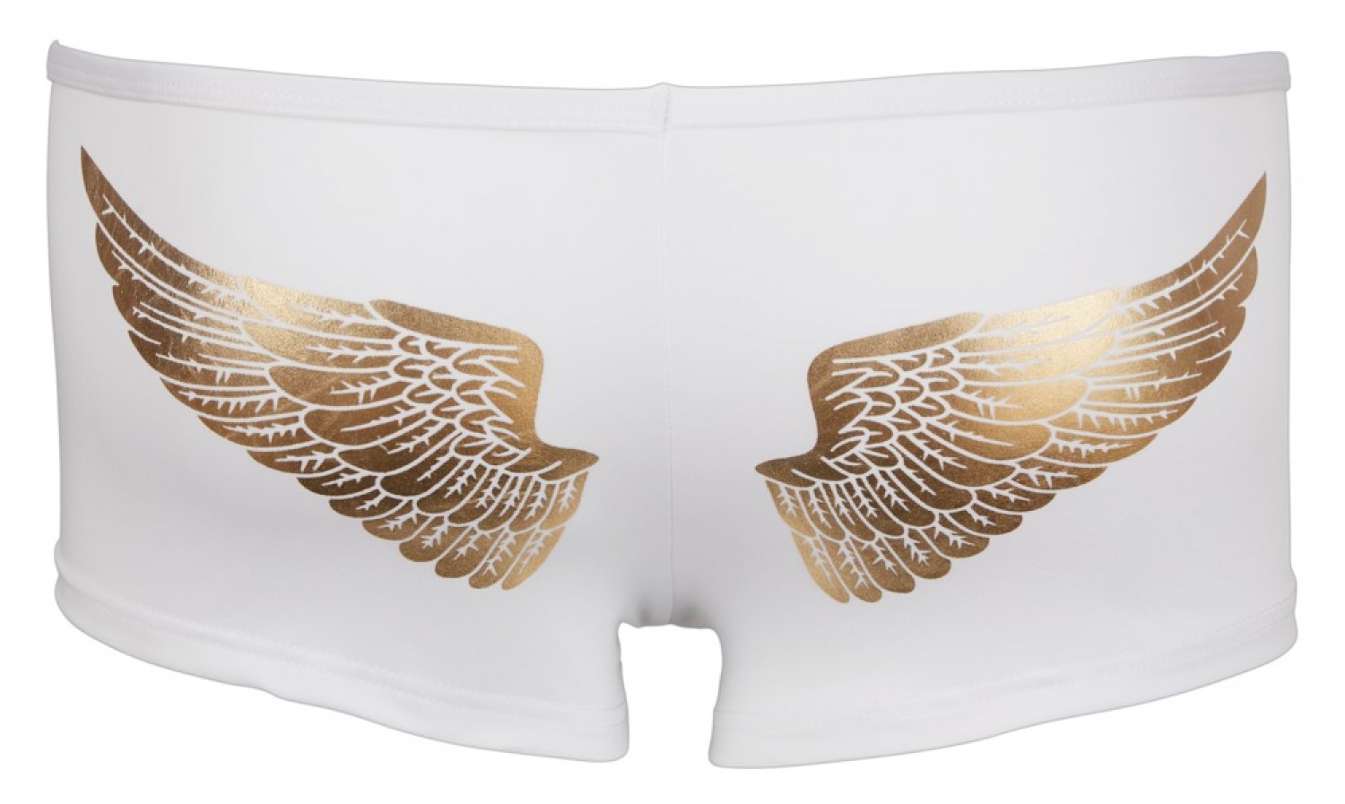 Rugalmas, mikroszálas fehér anyagból készült, rövid fazonú boxer, hátul csillogó angyalszárnyakkal elöl arany színű cipzárral.