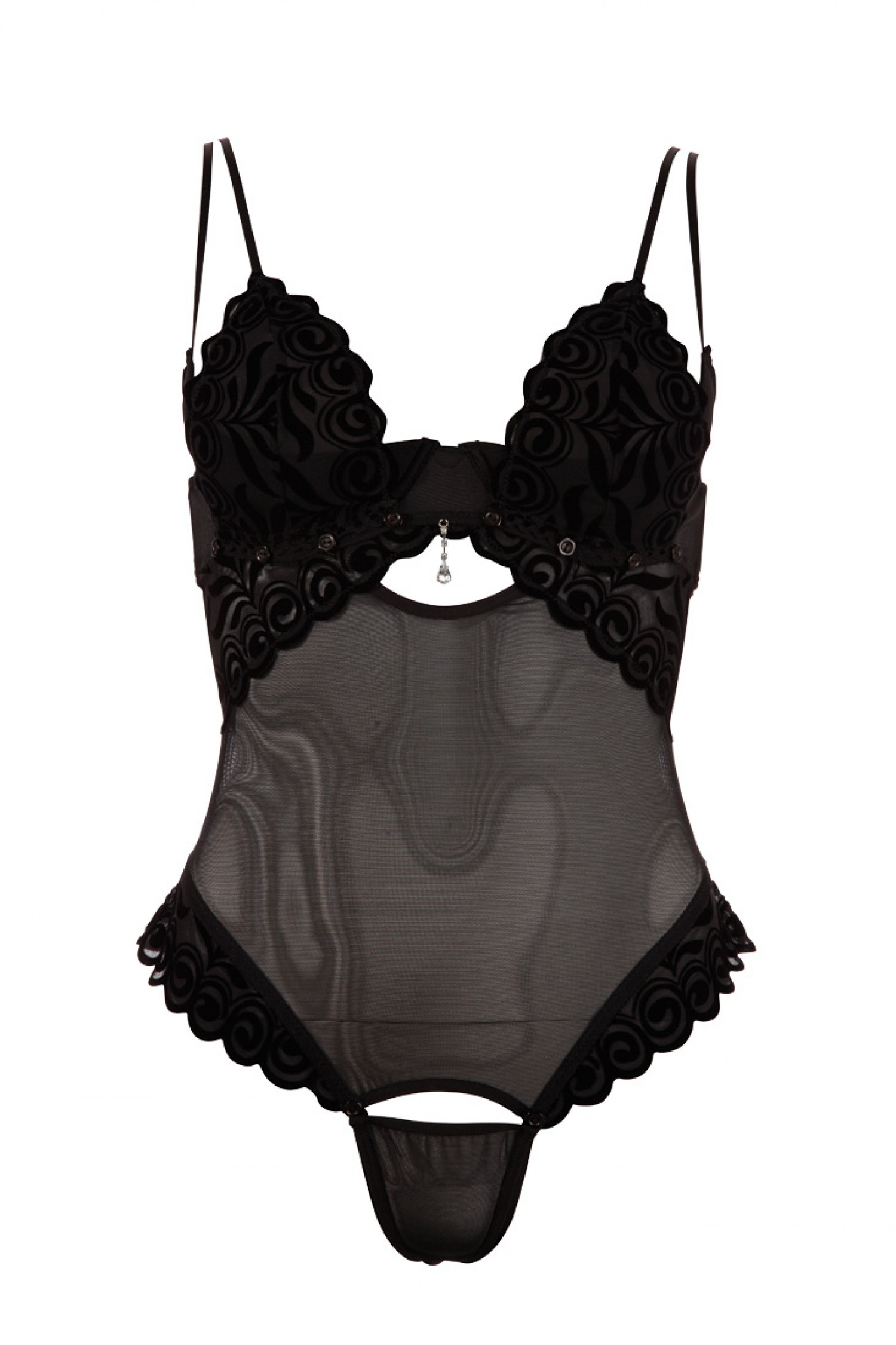 Áttetsző, rugalmas body, variálható, lepatentolható szeméremrésszel és mellrésszel. Bársonyos hímzésekkel díszítve.