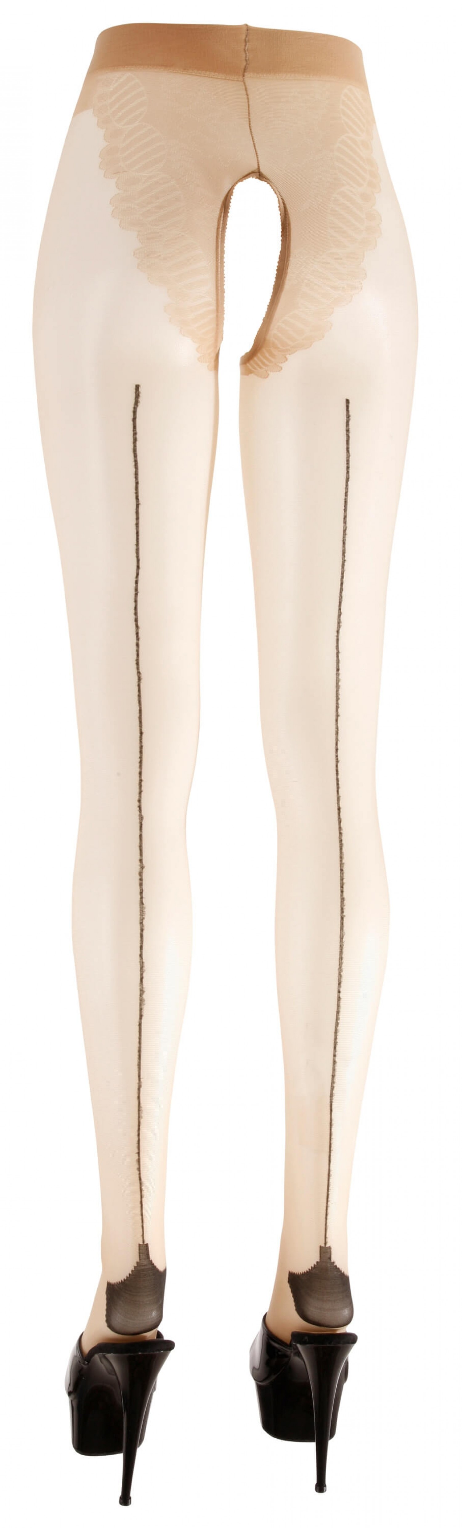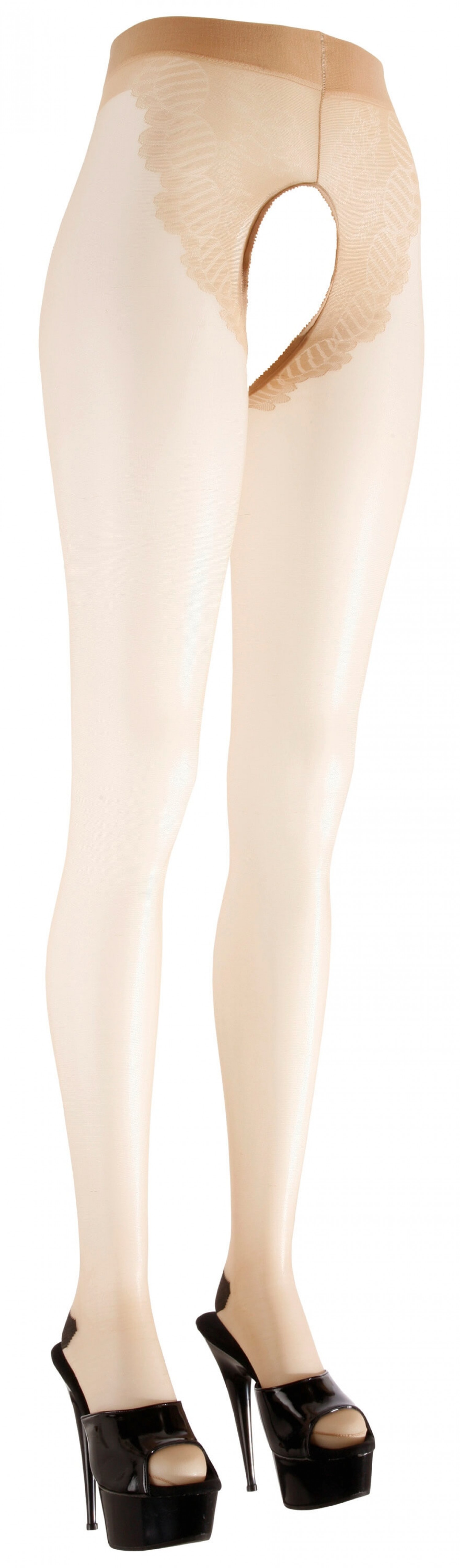 Natúr színben készült, középen nyitott szexharisnya (aktus közben is viselhető), elöl és a fenéken különleges szövéssel, ami olyan mint egy gyönyörű, csipkés alsó. A lábakon hátul szexi, fekete csíkkal, megerősített sarokkal.