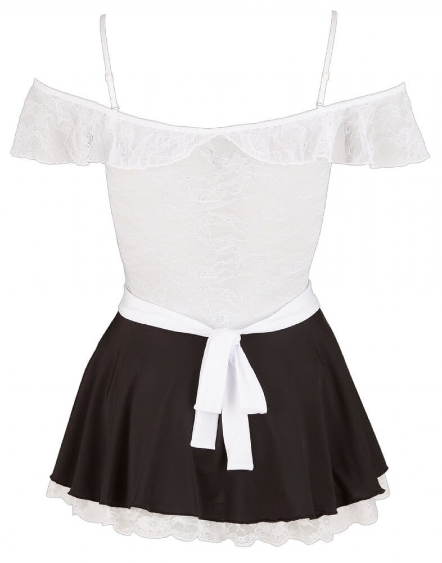 A ruha felső része rugalmas, fehér virágmintás csipke. Pántja gumis, ami vállra ejthető.