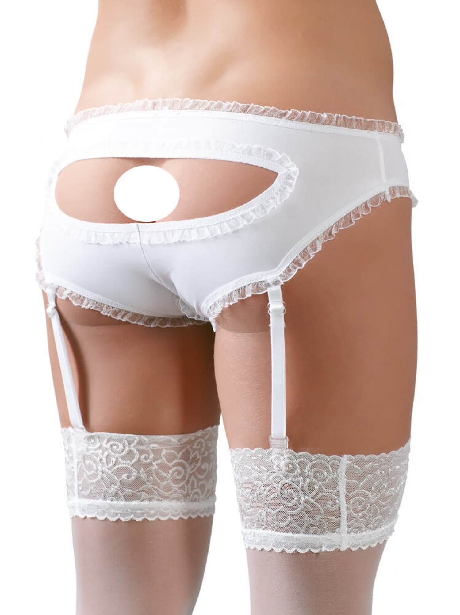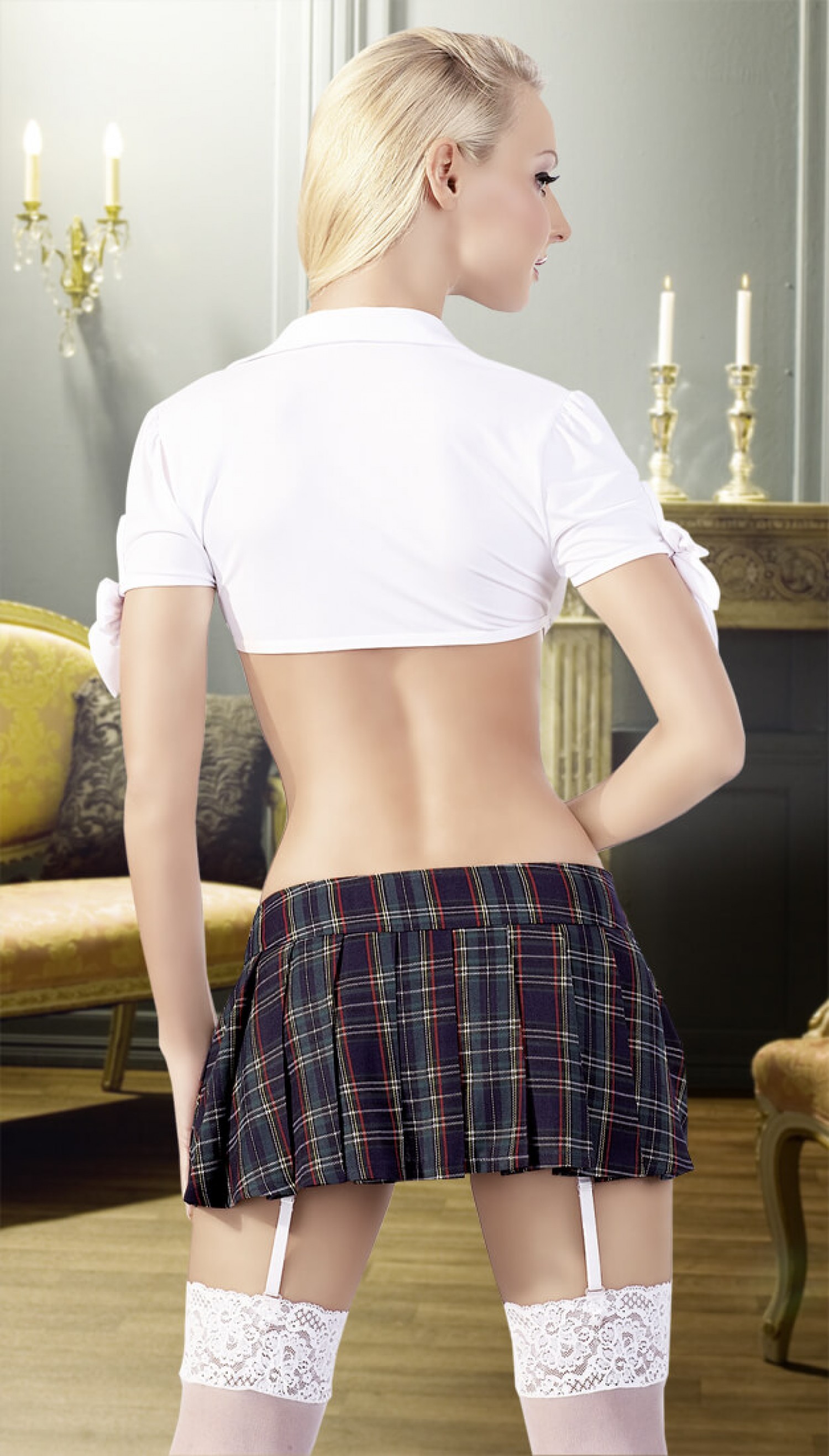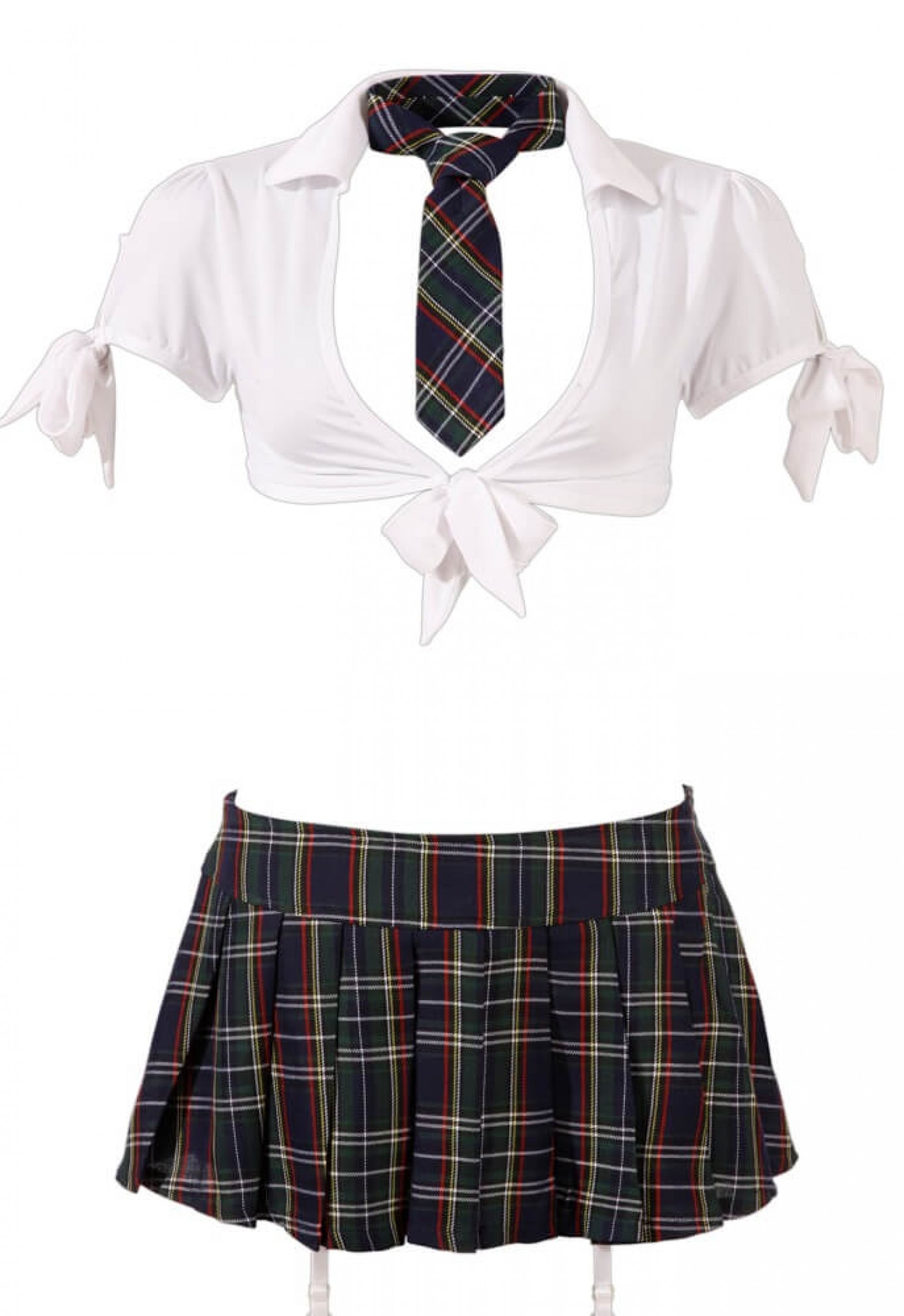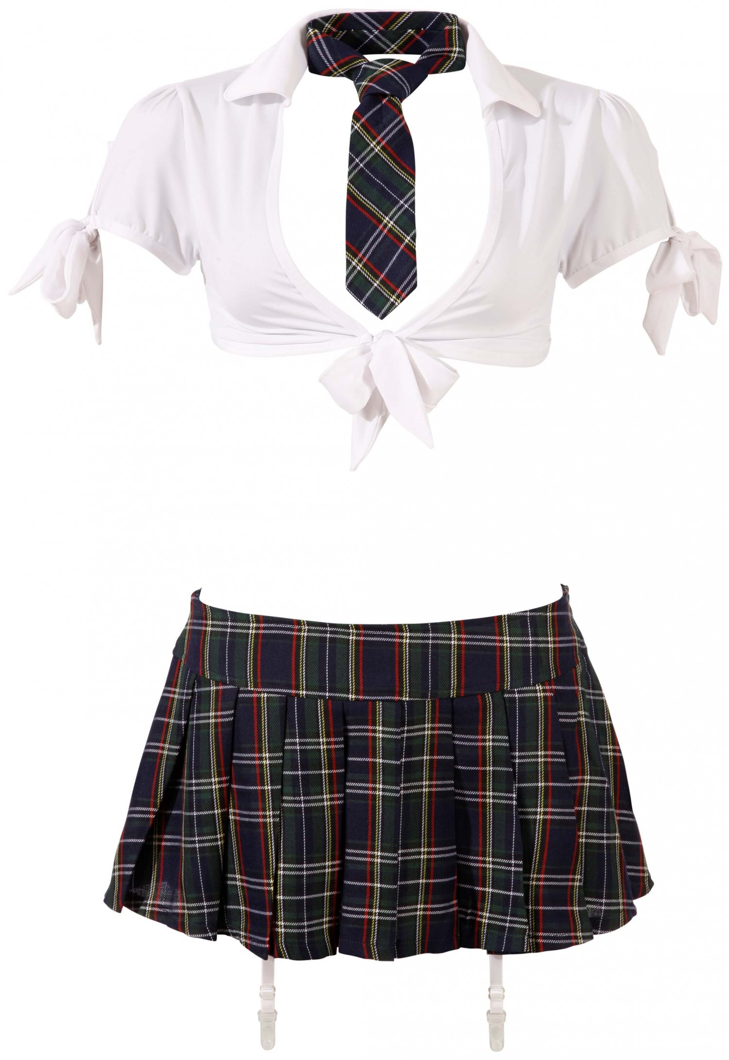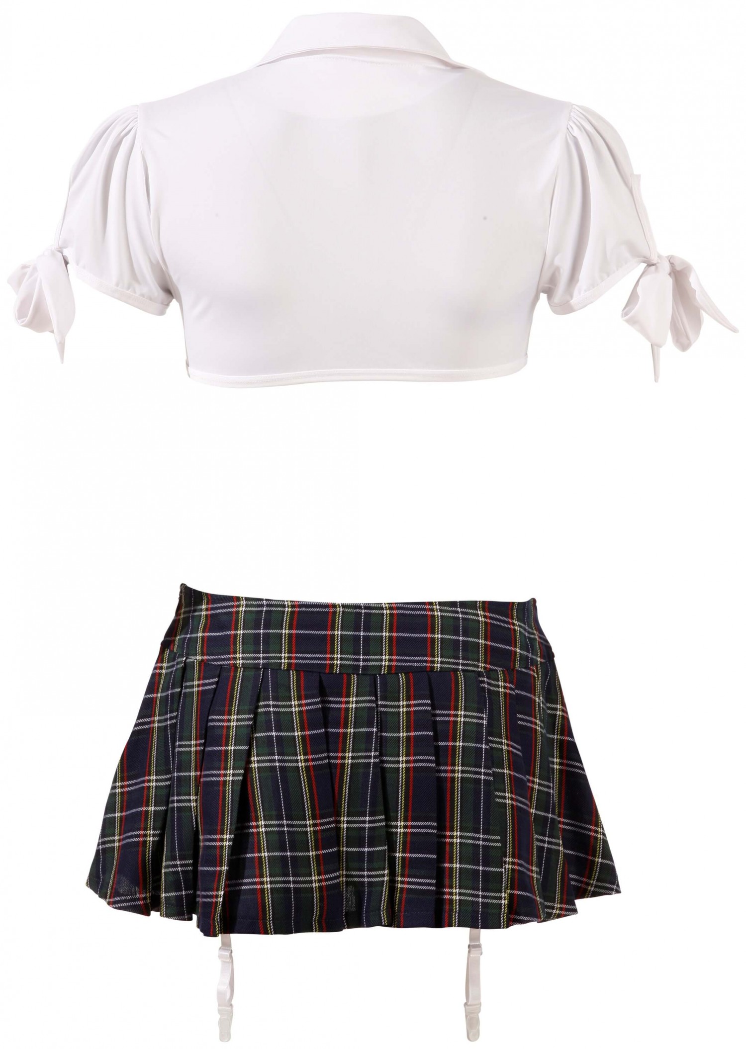 A szett fehér, mell alatt megköthető blúzt, egyedi fazonú, harisnyatartós bugyit, nyakkendőt és rakott szoknyát (oldalt cipzárral) tartalmaz. Kék skótszoknyás és fehér színösszeállítás. A felső és a bugyi anyaga: 95% Polyester, 5% Elasthan, a szoknya és a nyakkendő: 100% Polyester. Harisnya nélkül.