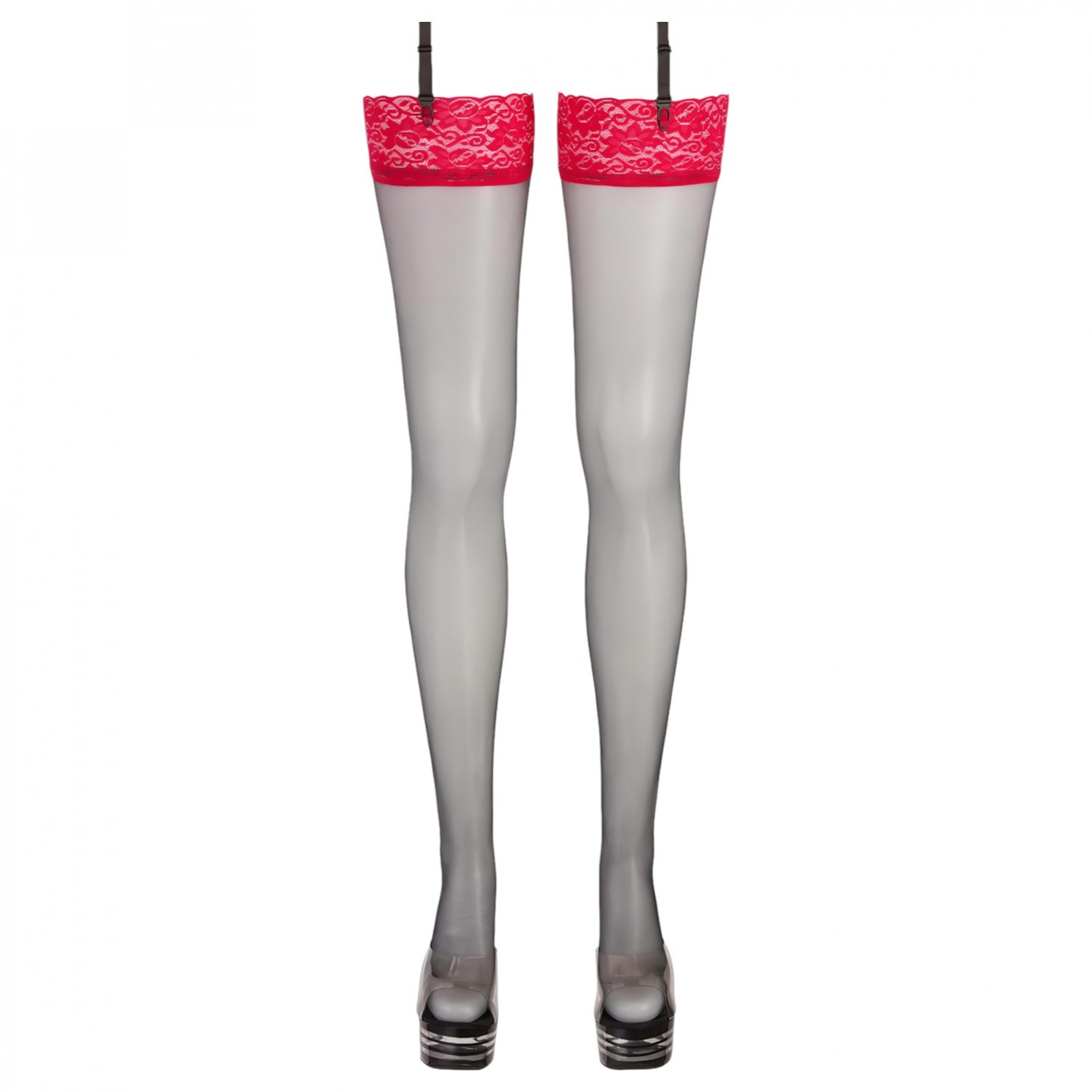 Rugalmas, 20 DEN vastagságú, áttetsző fekete anyagból készülő harisnya, széles, piros csipkeszegéllyel.