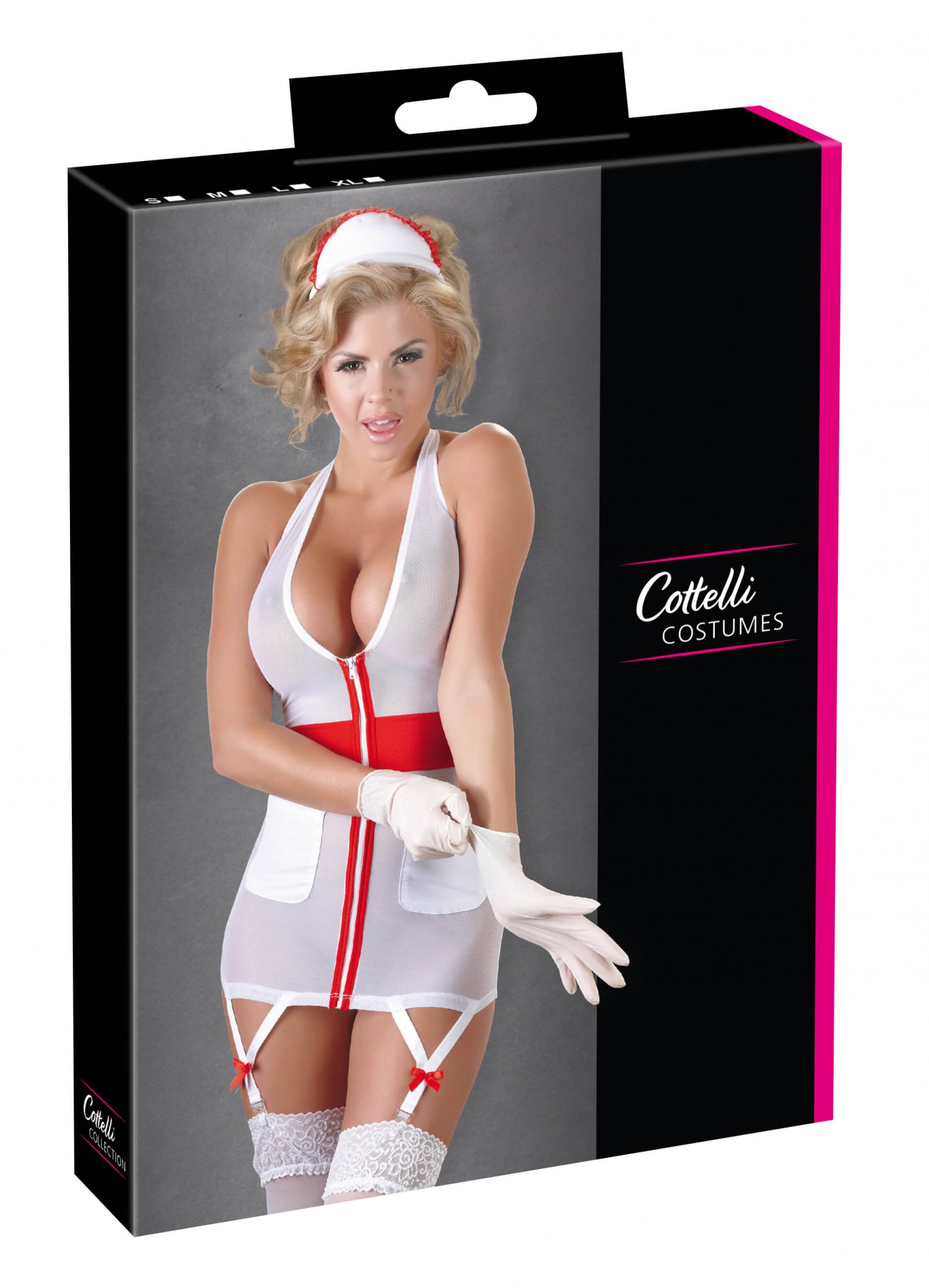 Rugalmas, áttetsző anyagból készült, nyakpántos miniruha, elöl végig cipzárral, két zsebbel és lent két harisnyatartó pánttal. Extra mély dekoltázzsal, a derékrészen piros csíkkal.