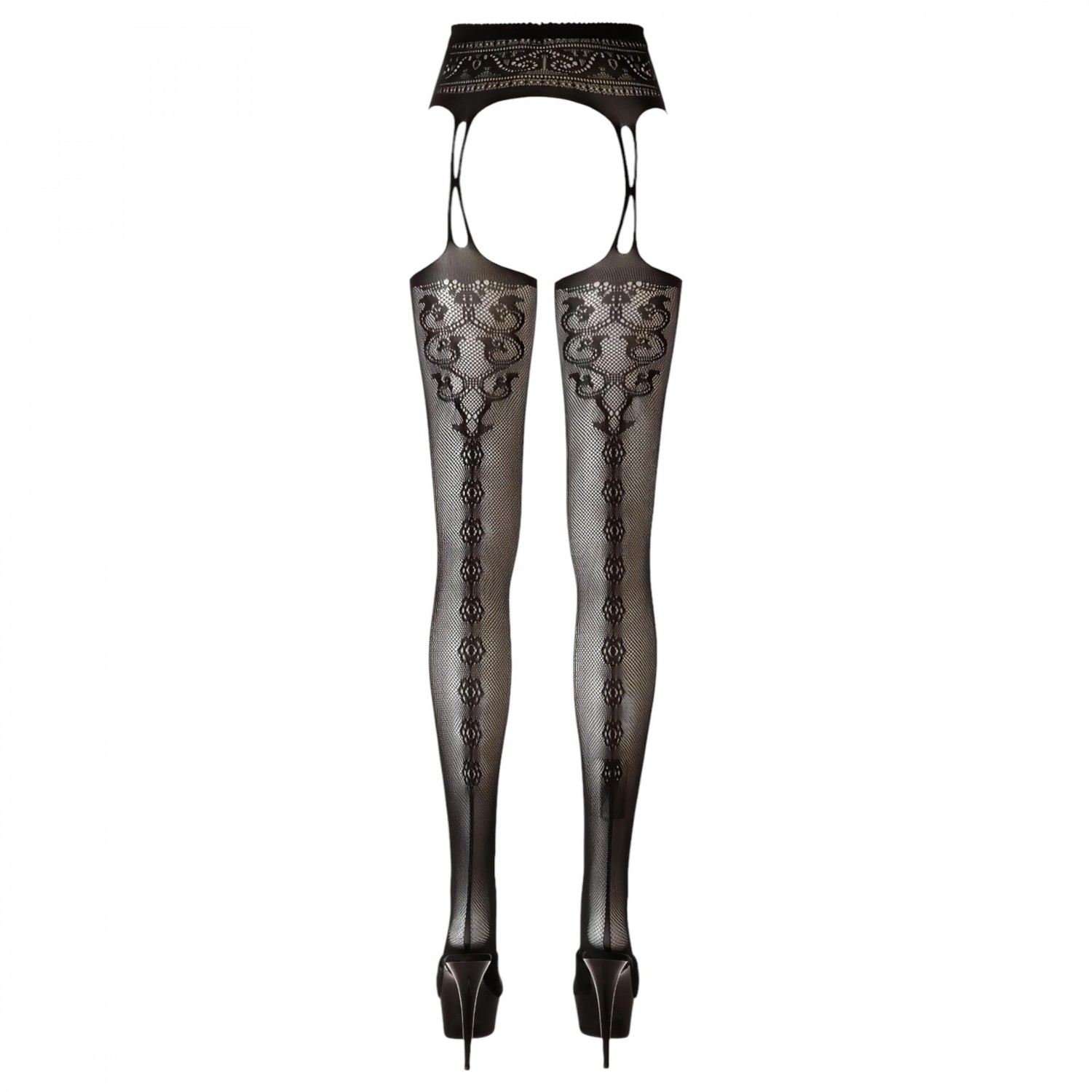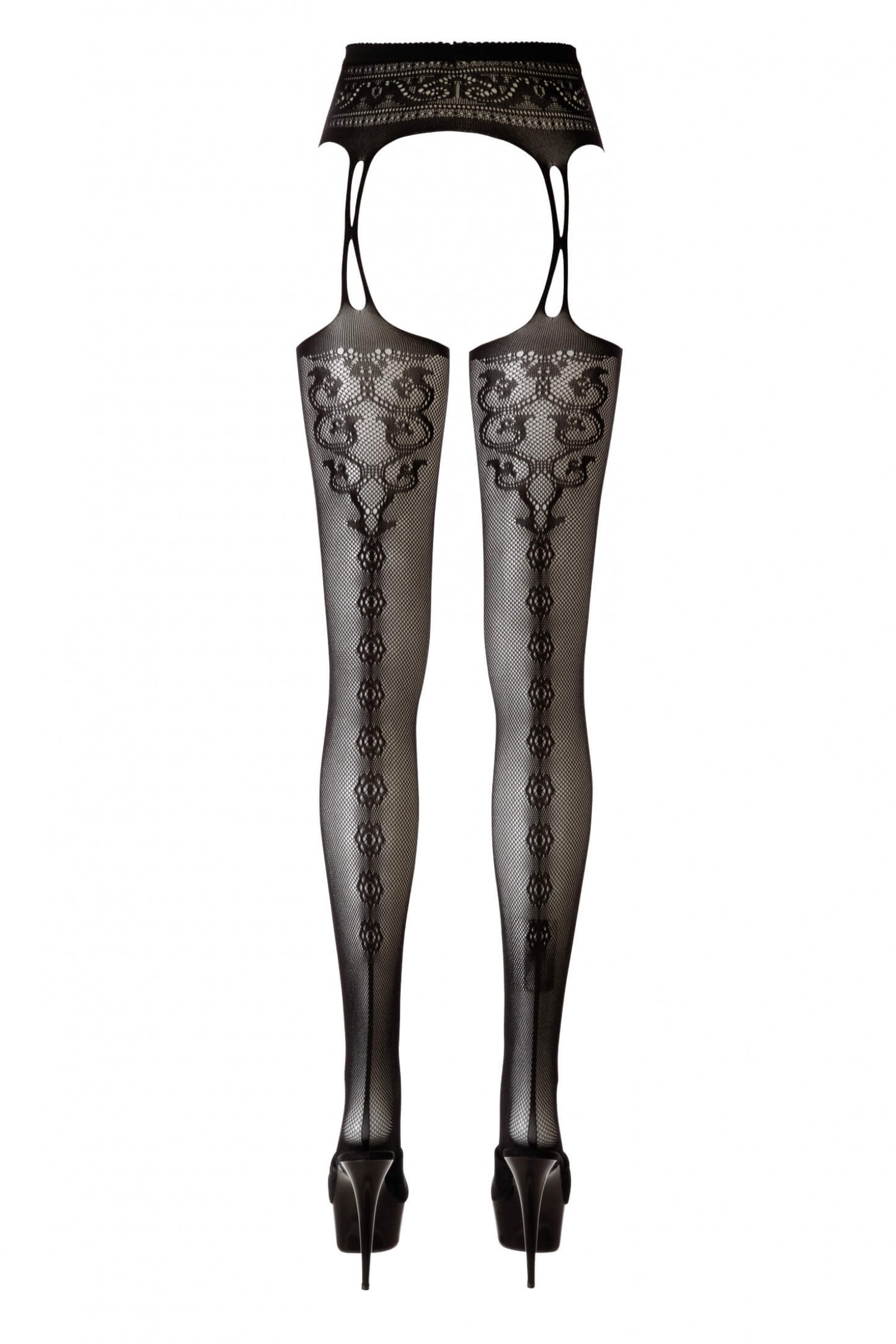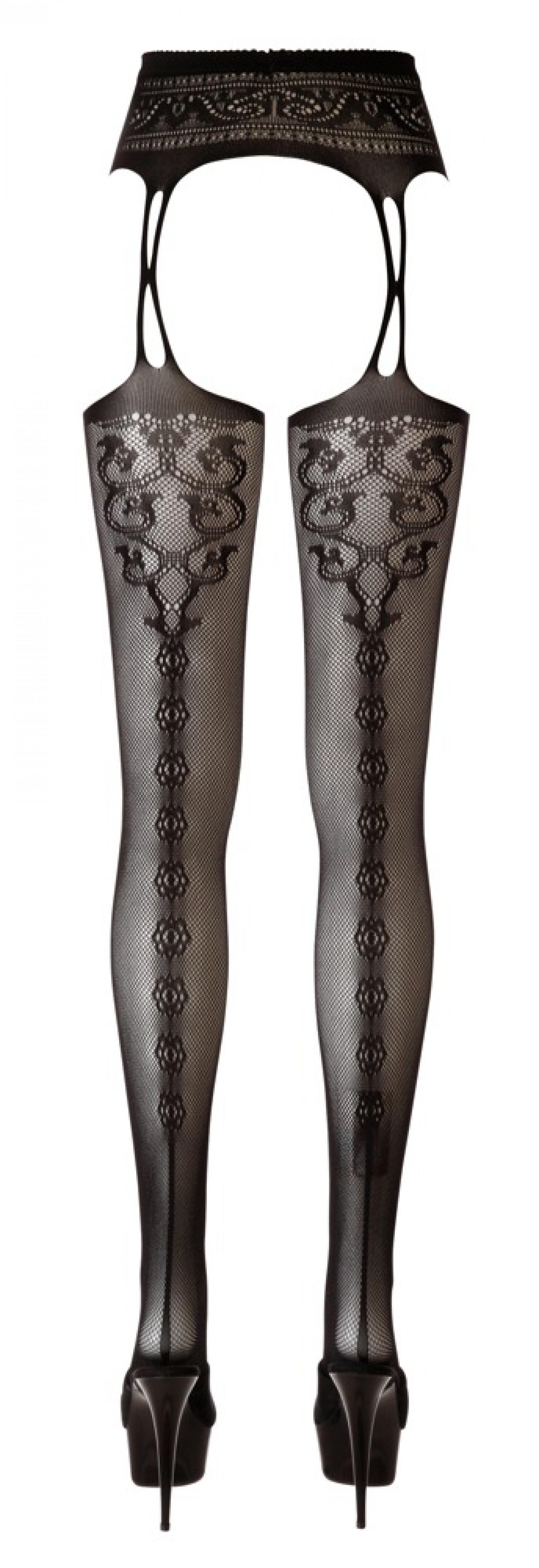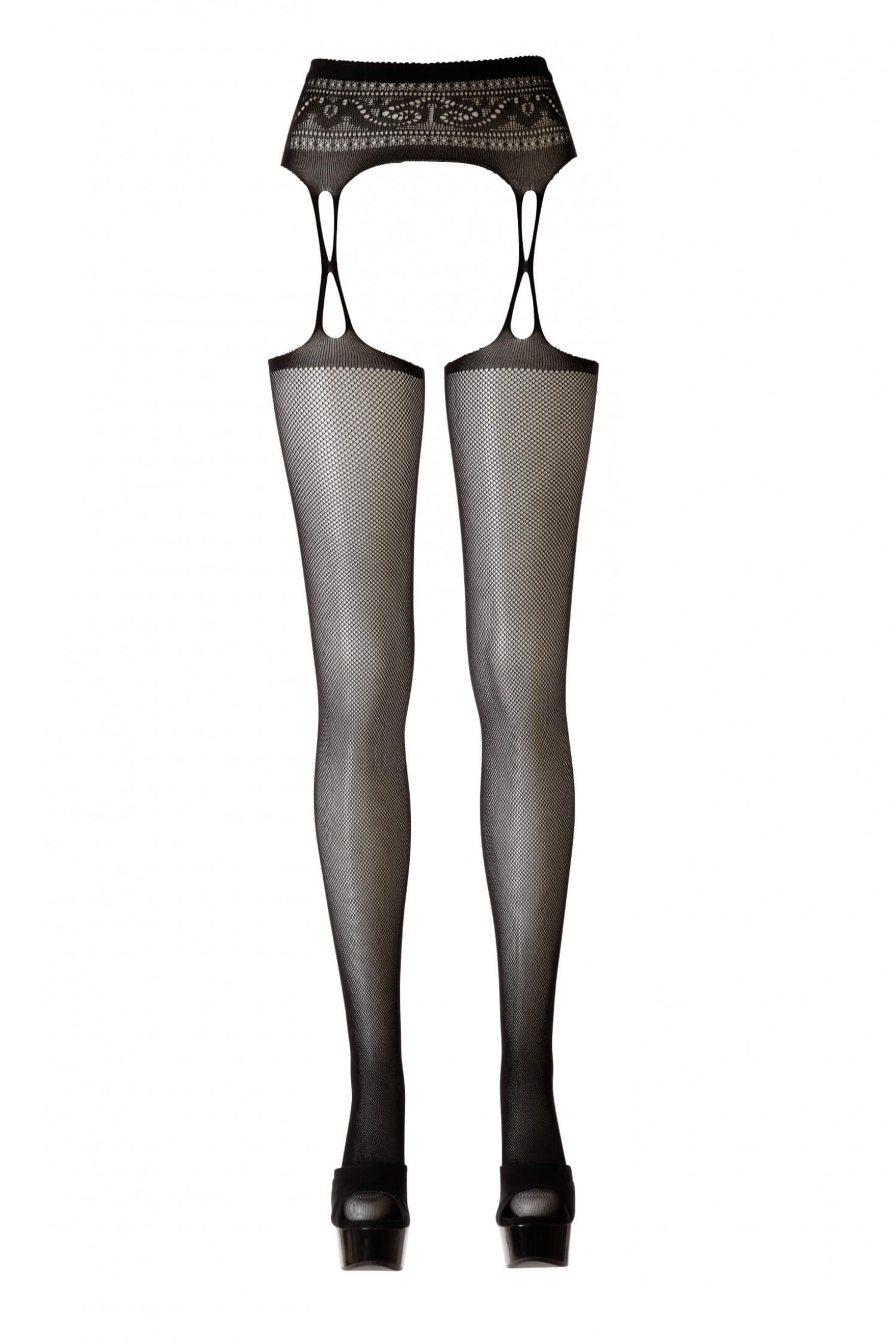 Harisnya és harisnyatartó egybevarrva vékony pántokkal, csipke hatású díszítésekkel és merész motívumokkal.