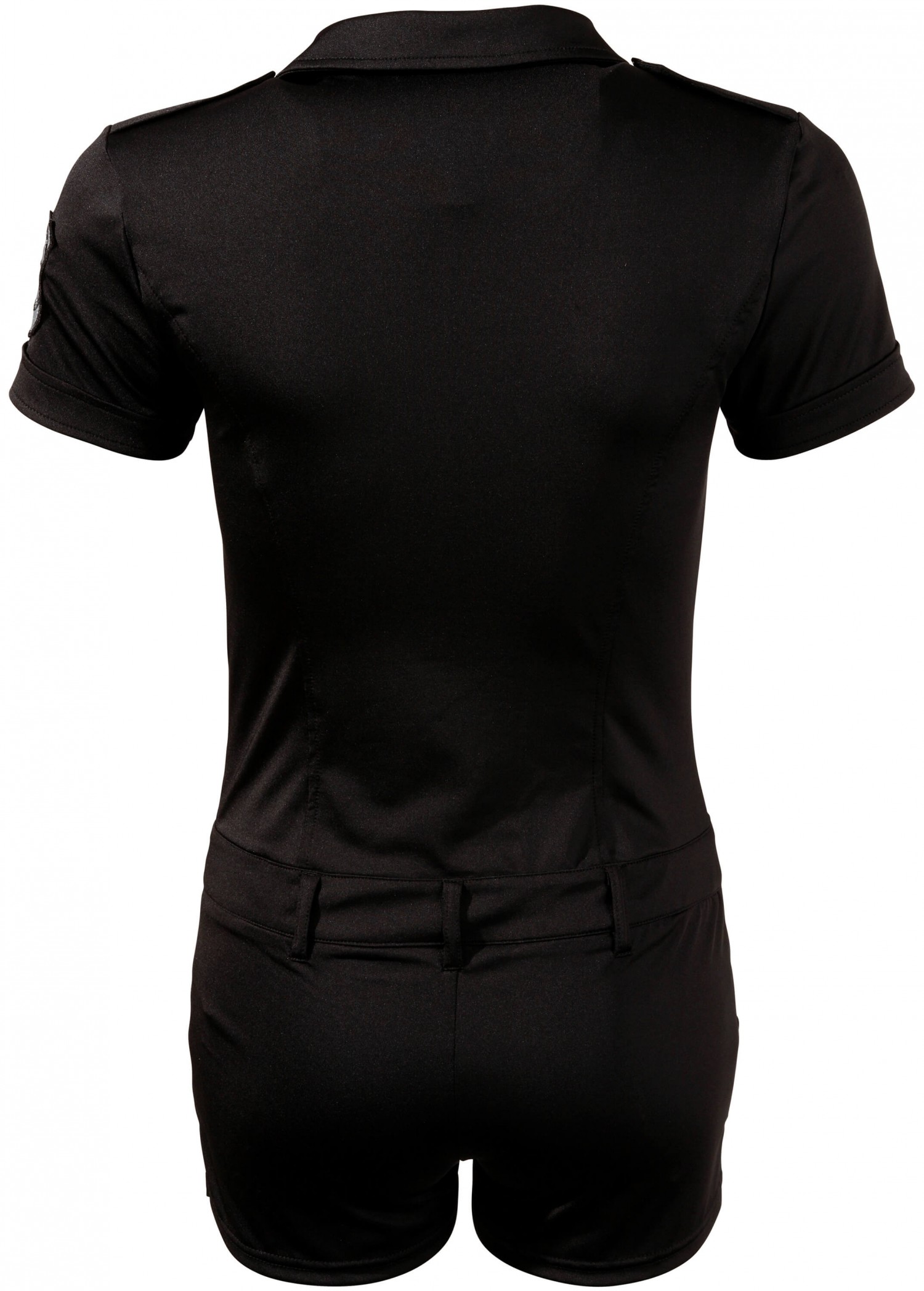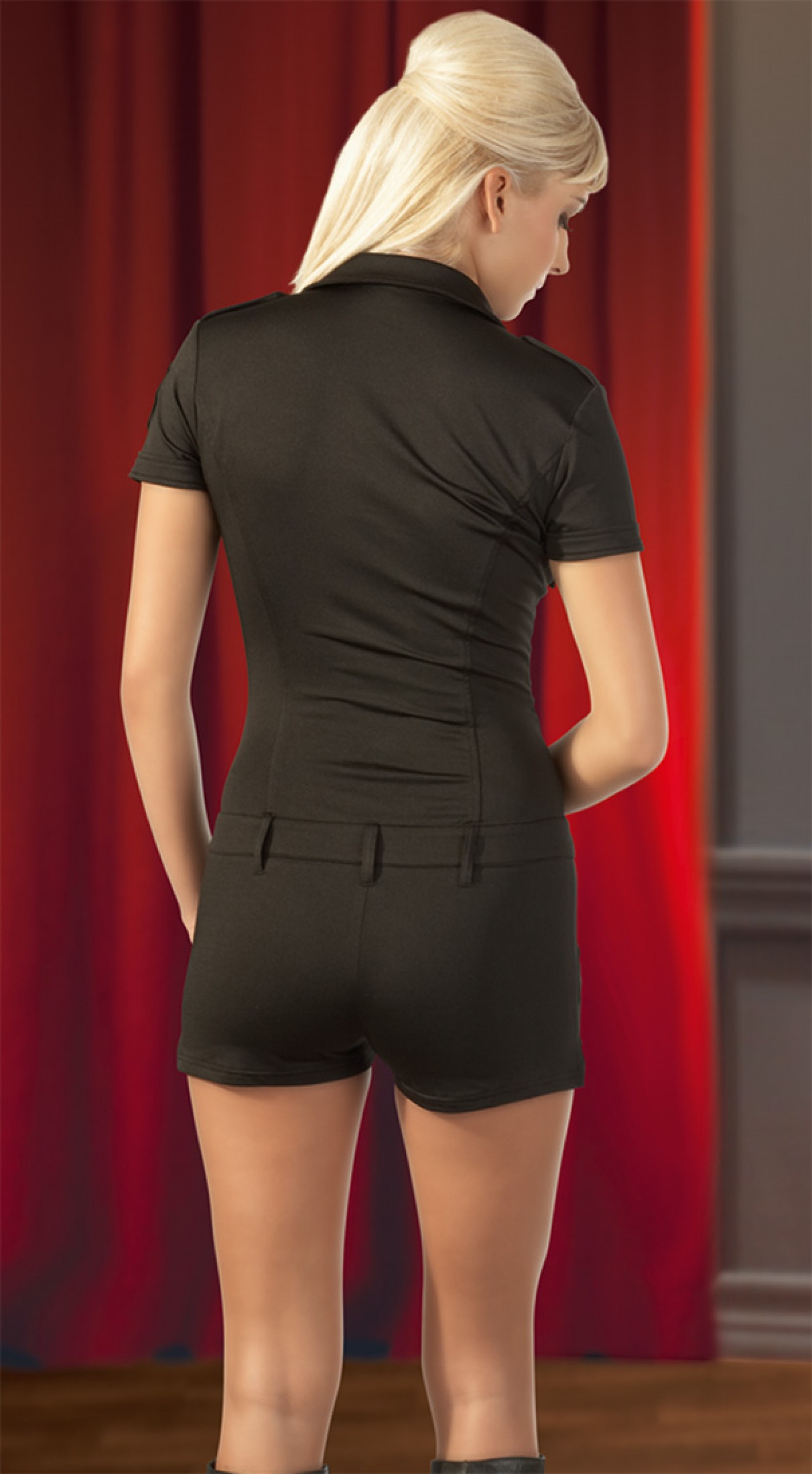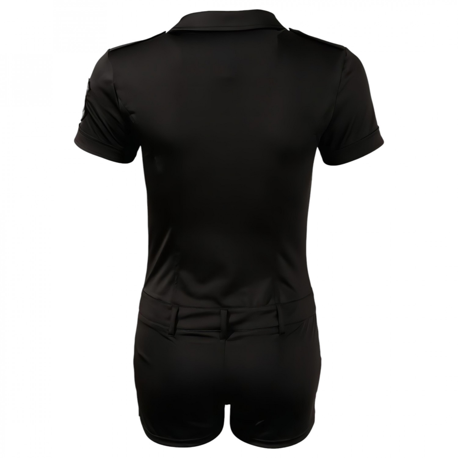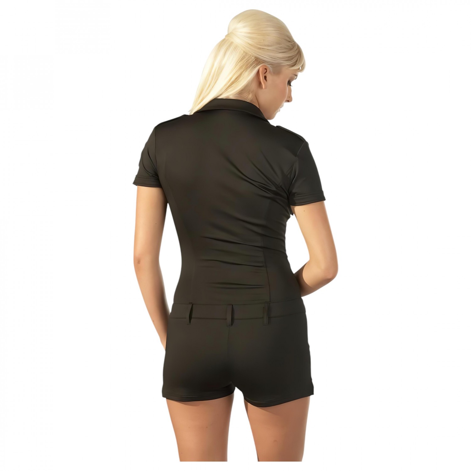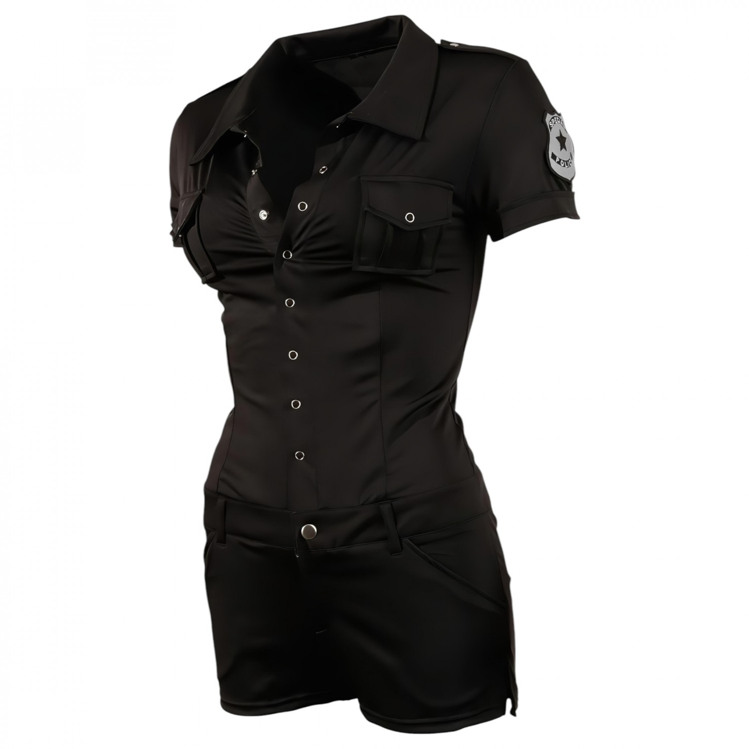 Egy ilyen rendőrnőnek egy férfi sem tud ellenállni. A karcsúsított fazonnak köszönhetően a minioverall szépen követi teste vonalát. Fekete, rugalmas anyagból készül elöl az övtartóig patentos, ott gombos, és a nadrág résznél cipzár van. A melleken apró zsebek találhatók, ujját Special Police embléma díszíti. 90% Polyester, 10% Elasthan.