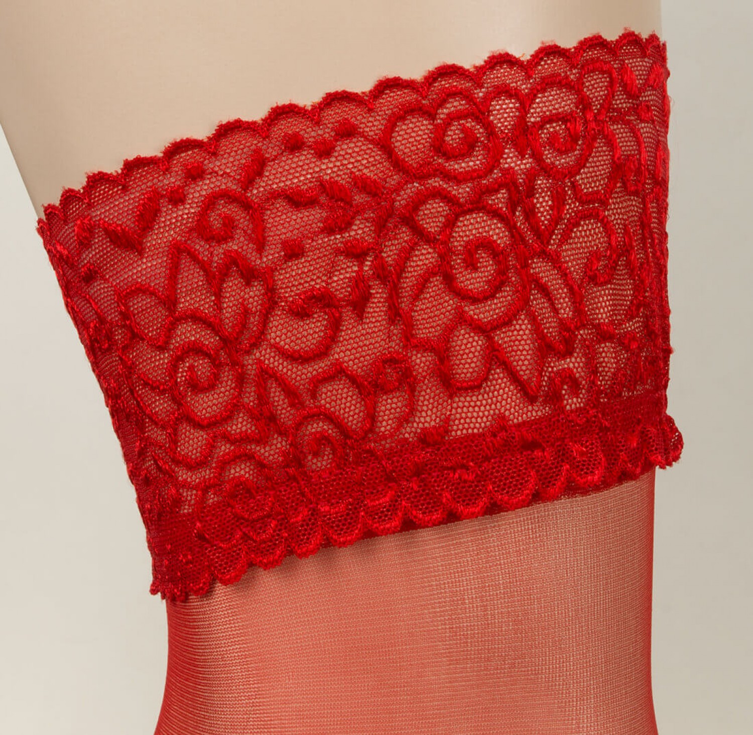 Vadító piros színben készült, fényesen csillogó, szaténos combfix, szexi, széles csipkeszegéllyel, amely szilikonos megerősítéssel lett ellátva, hogy combfixed biztosan a helyén maradjon.