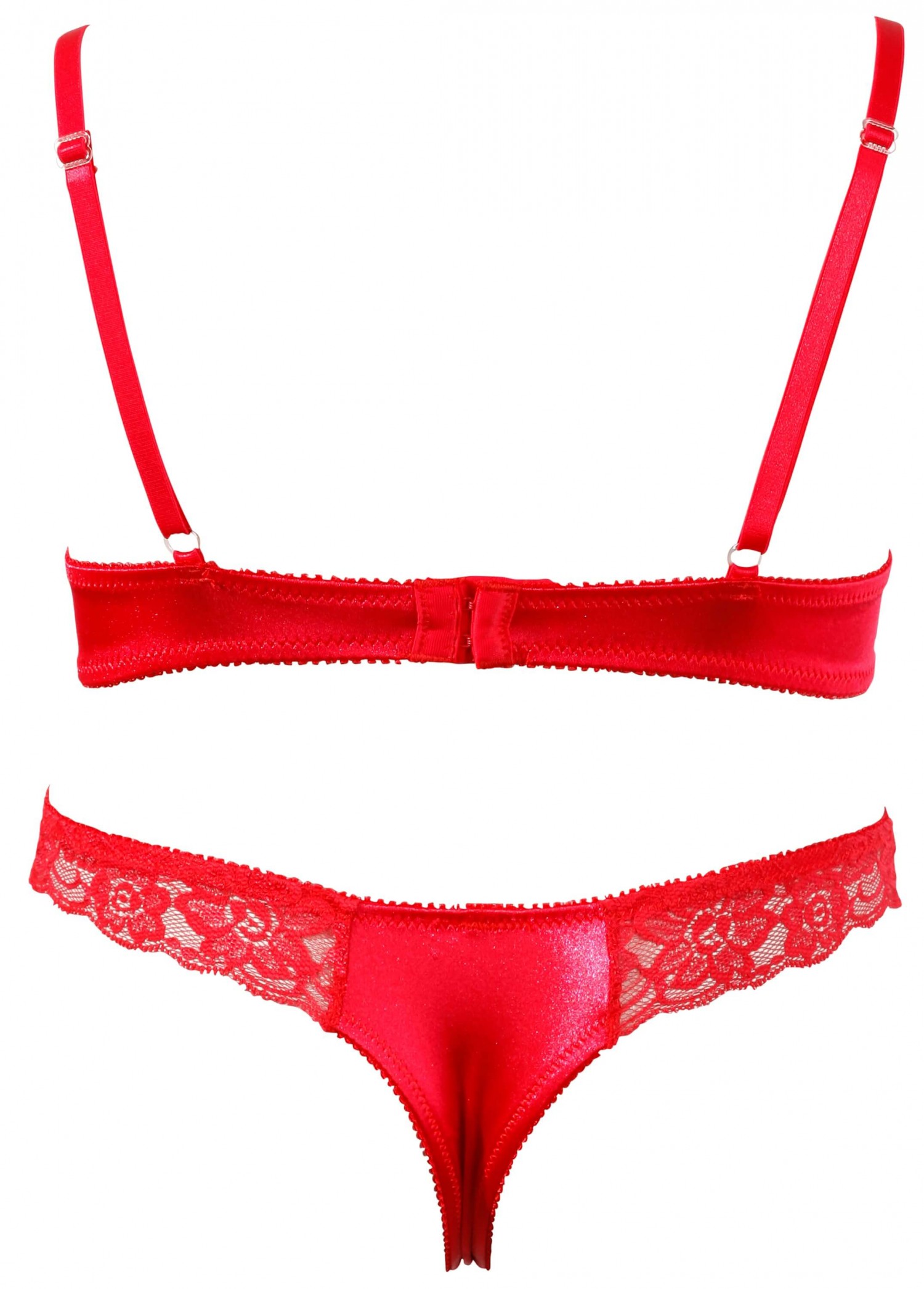 Selymes, fényes szaténból készült, gyönyörű csipkedíszítéssel. Enyhén bélelt kosárral, a tanga elöl nyitott. Anyaga: 85% Polyamid, 15% Elasthan.