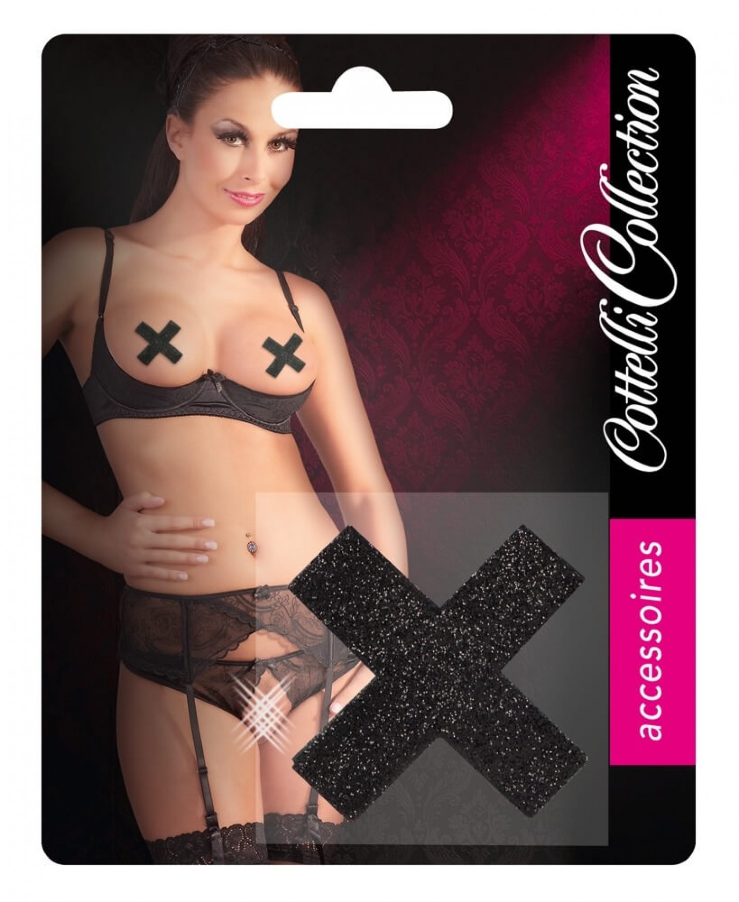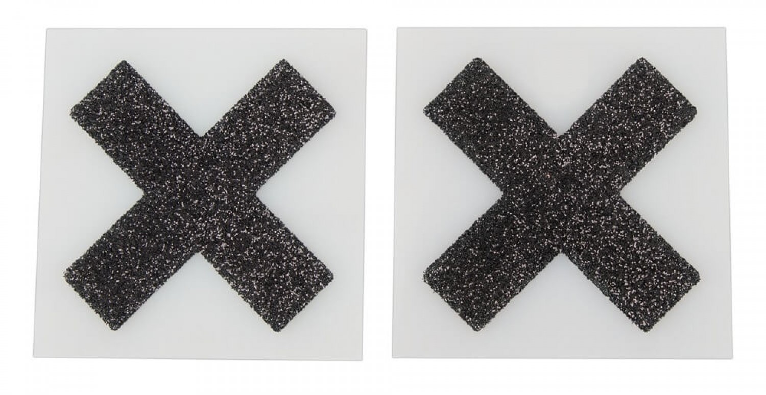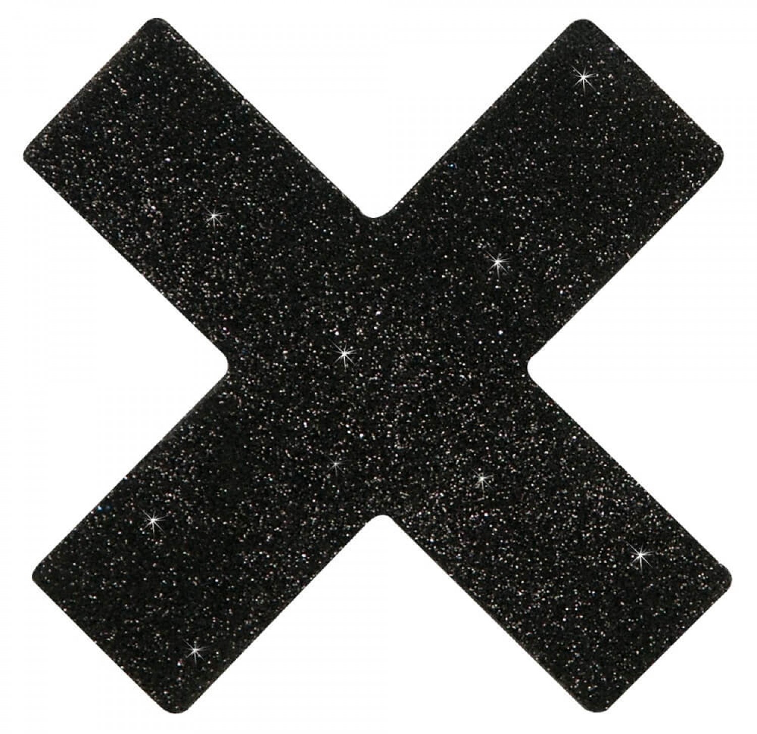 Két részes felragasztható(öntapadós) mellbimbódísz szett. Gyönyörűen csillogó, fekete X-ek, melyek diszkréten takarják a mellbimbókat. A díszek mérete: 5,9 x 5,9cm. Anyaga: 80% Papír, 15% PET, 5% Kleber. 1pár a csomagban.
