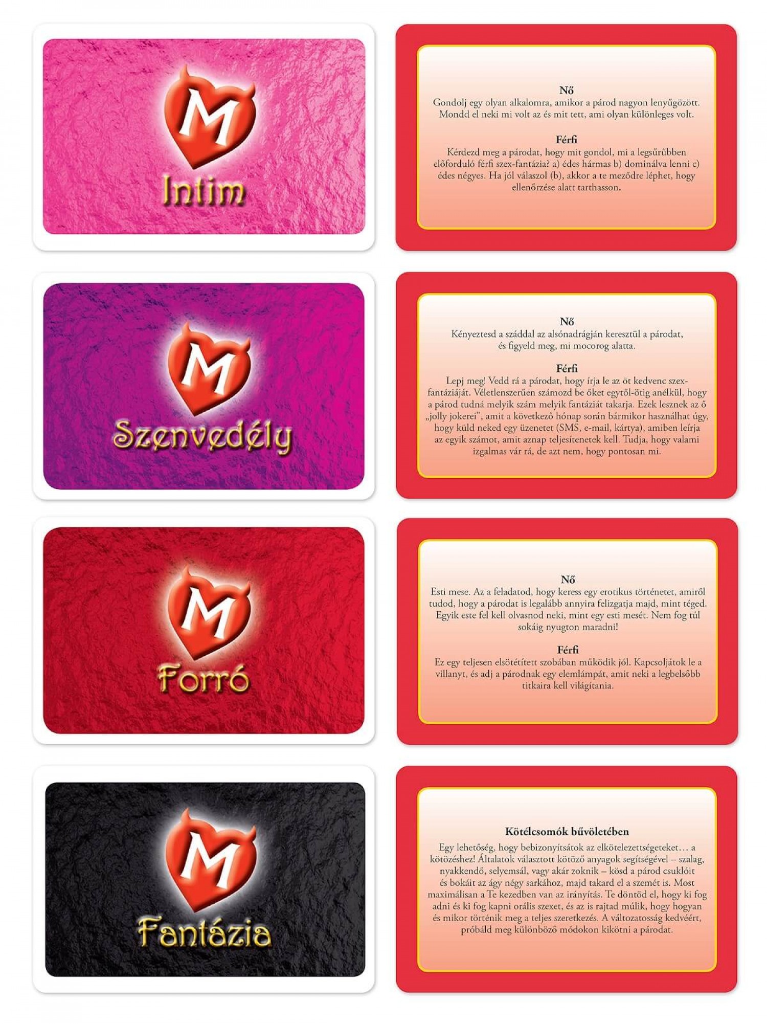 A játék során több, mint 390 szórakoztató feladat vár rátok, három különböző szinten (Intim, Szenvedély, Forró). Ahogy a játék halad előre vidám párbeszédekben és izgalmas feladatokban lesz részetek, mialatt egyre többet tudtok meg egymás testéről, elméjéről, egyre közelebb érve ahhoz a felismeréshez, hogy mi az, ami a párotokat igazán lázba hozza! A szinteken előrehaladva ahogy a hangulatotok egyre fokozódik, úgy válnak a feladatok is egyre intimebbekké, szenvedélyesebbekké, forróbbakká!