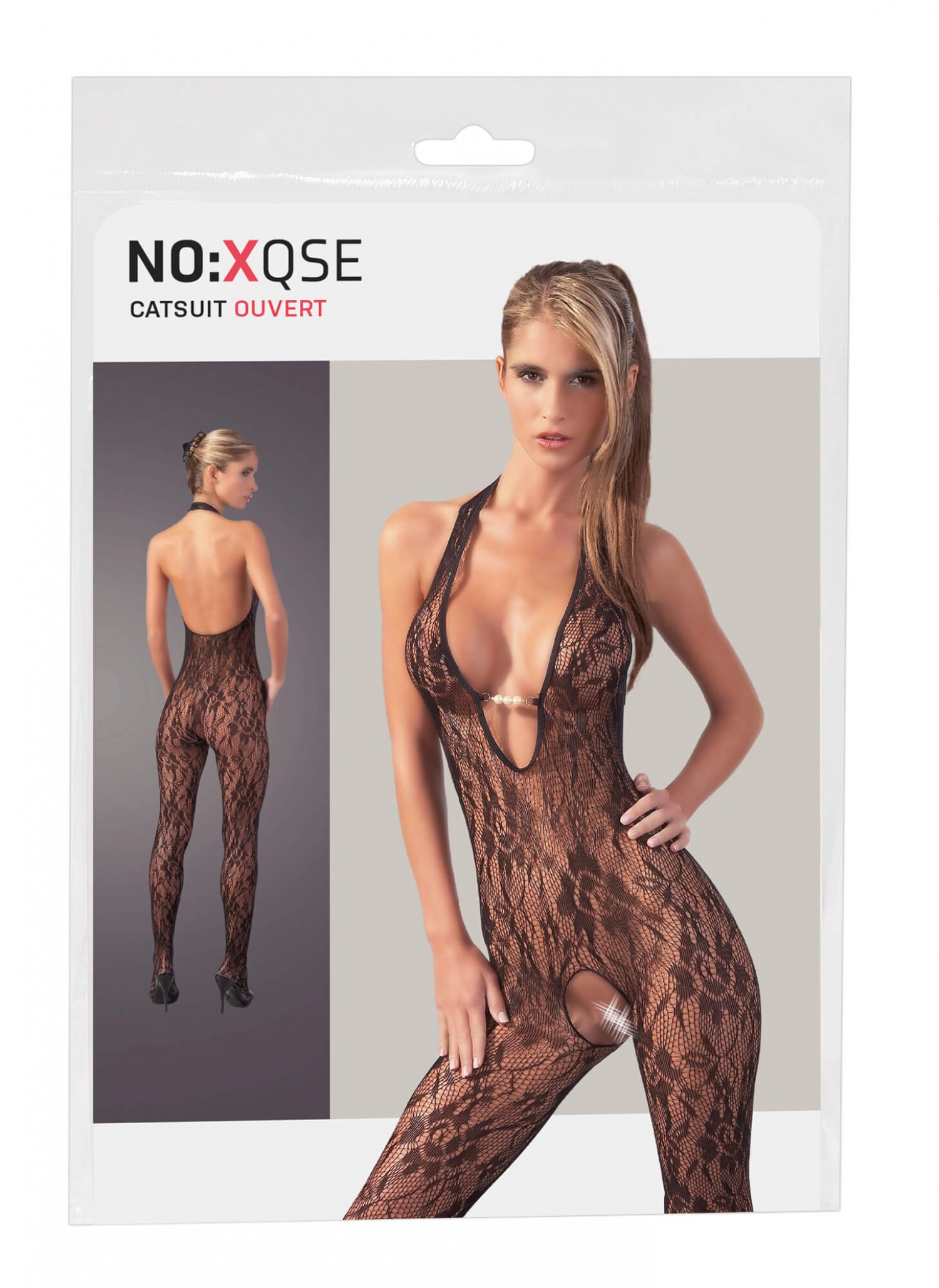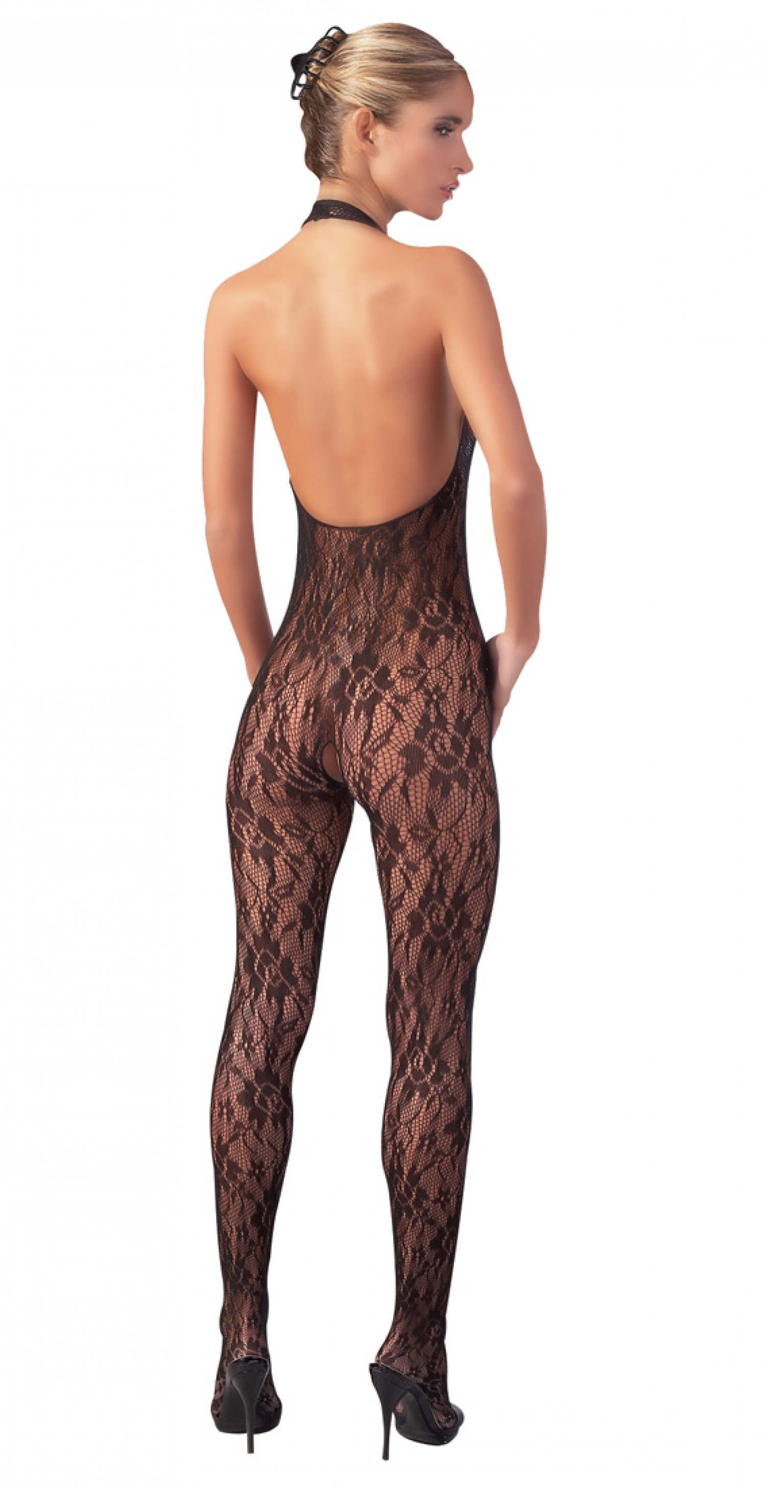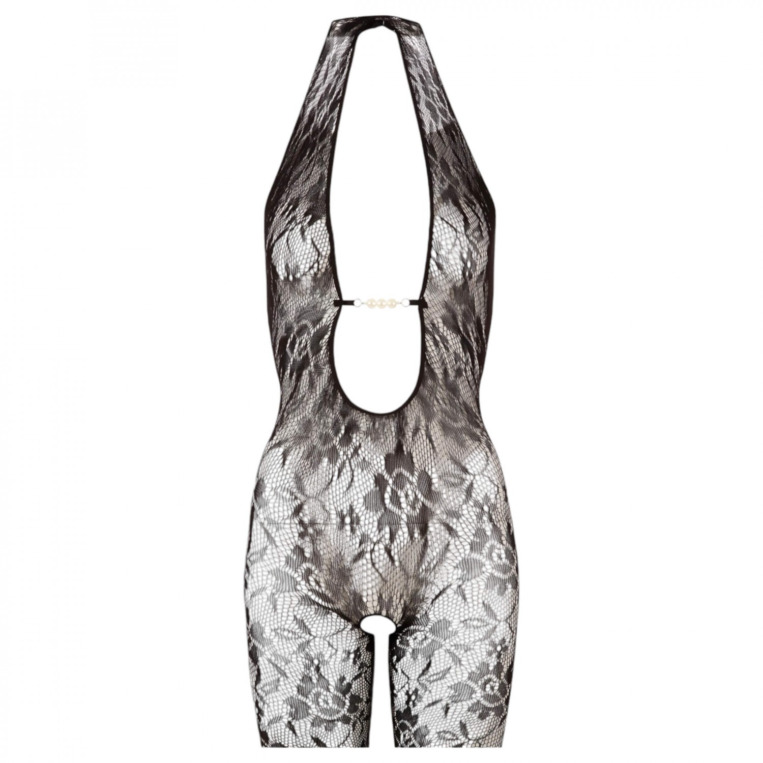 Puha csipke tetőtől talpig. Látványos szövésű, rugalmas csipkéből készült, szeméremnél nyitott overall, mély, gyöngyökkel díszített dekoltázzsal. Nyakpántos kialakítású, mély hátkivágással. Fekete színben. Mérete: S/M. Anyaga: 100% Polyamid.