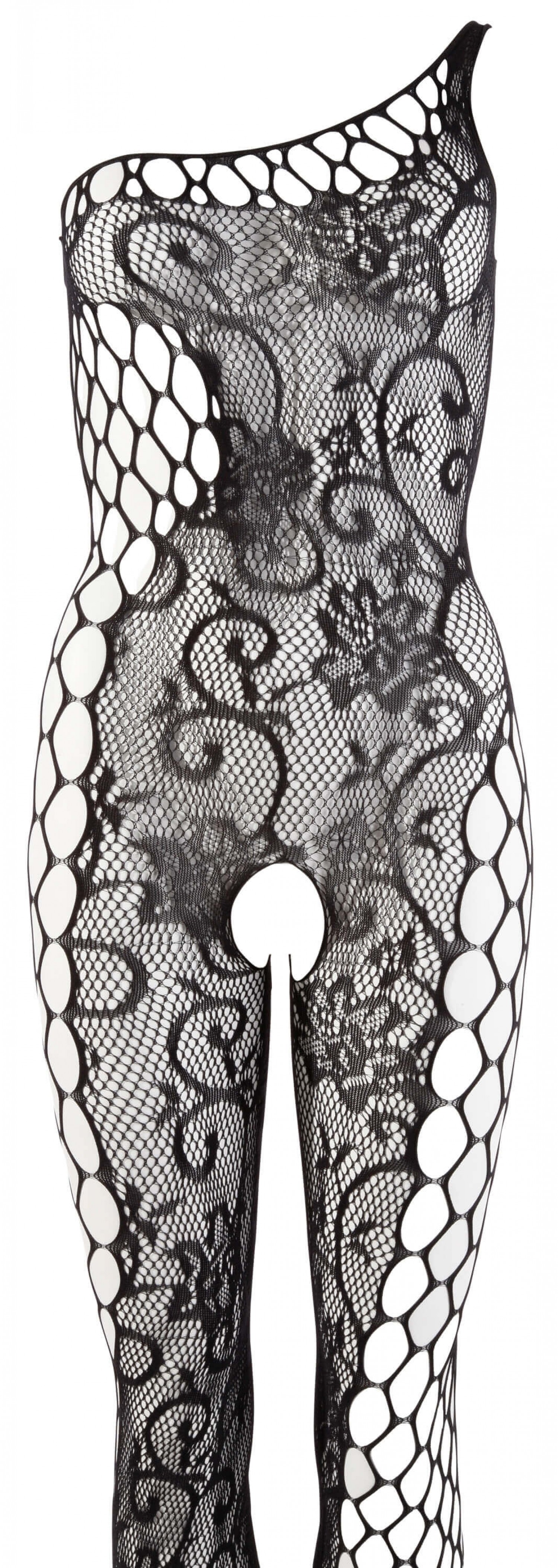 Varrásmentes, rugalmas, áttetsző, sűrű szövésű neccből készült overall, középen indás-virágos mintákkal, kétoldalt és a dekoltázsnál nagyszemű, lyukacsos neccel kiegészülve.