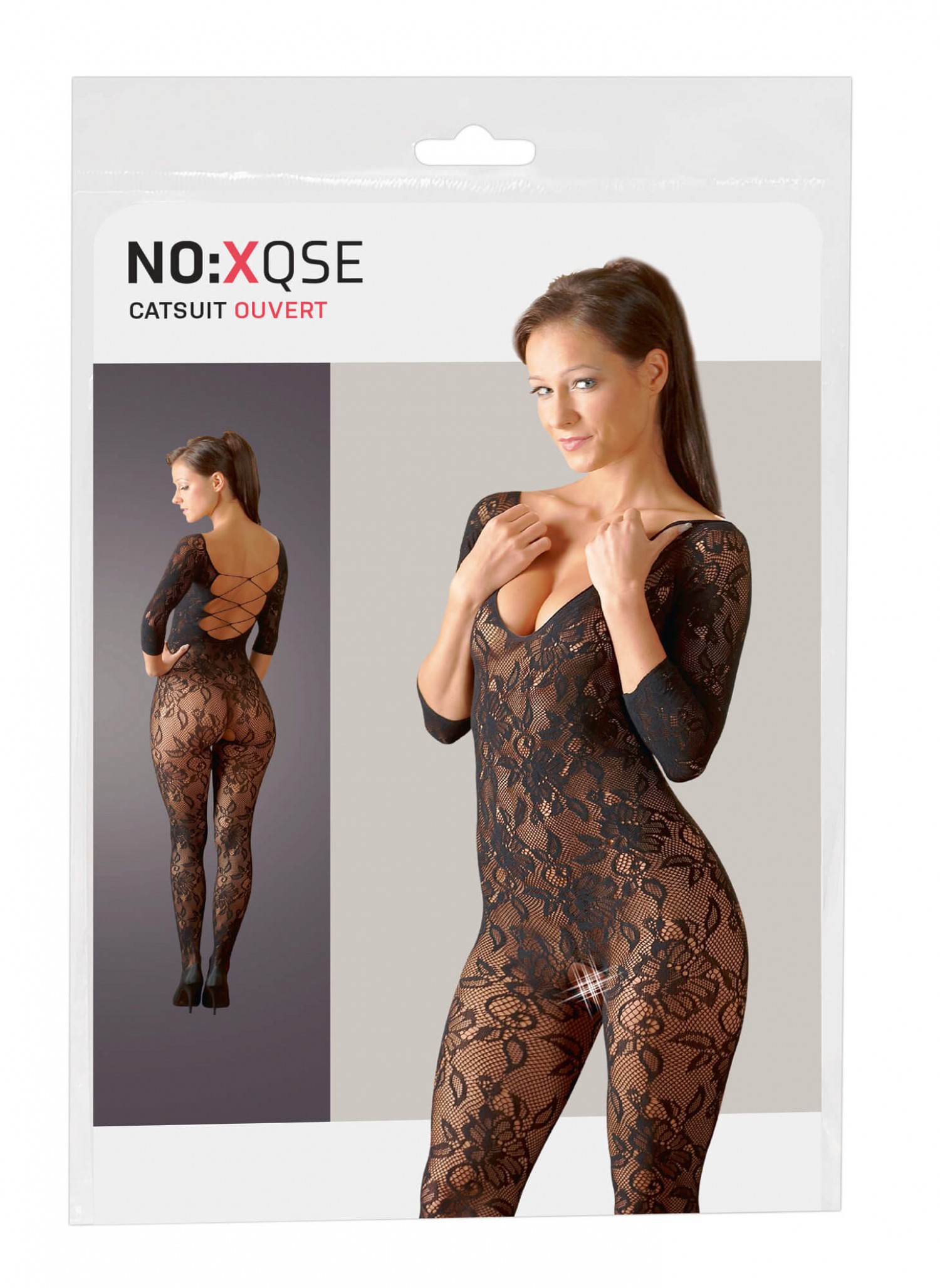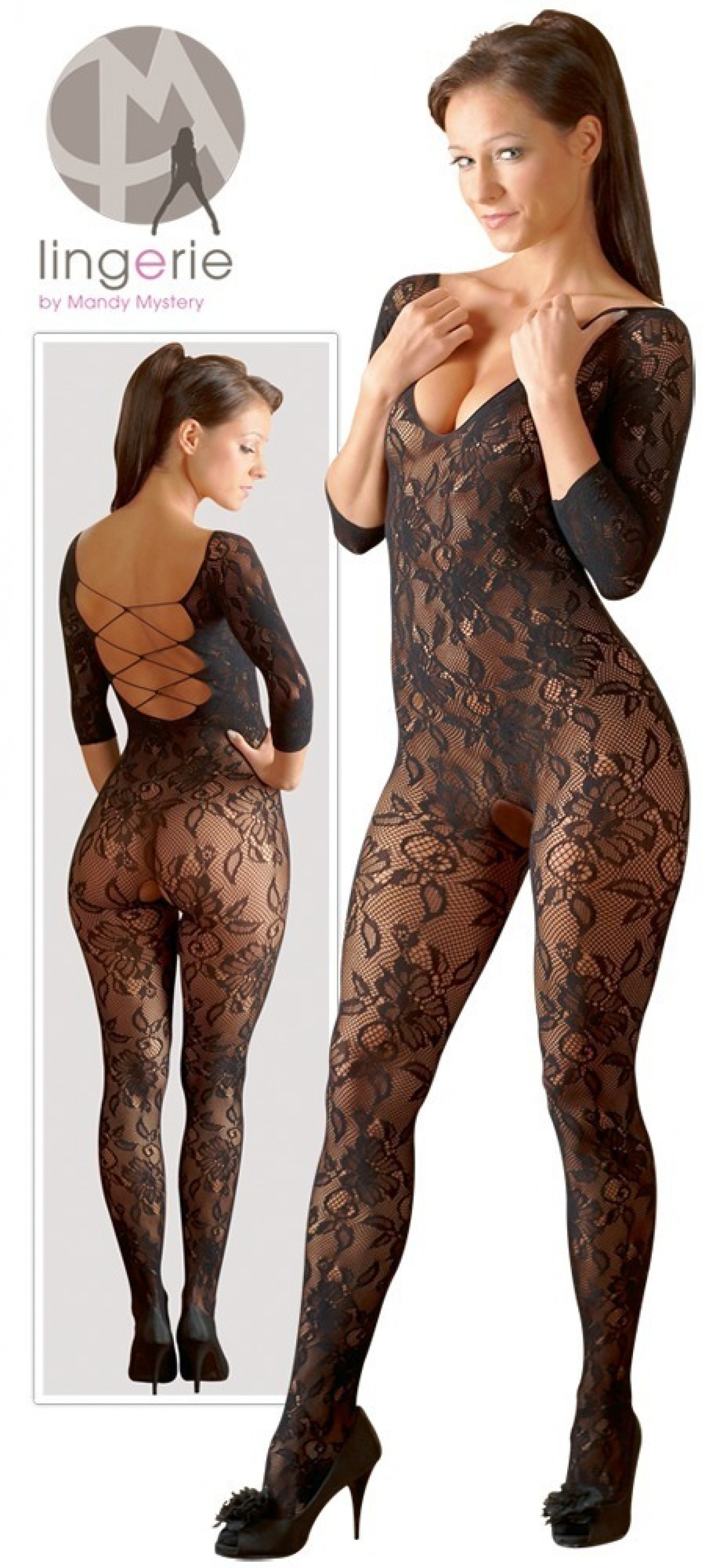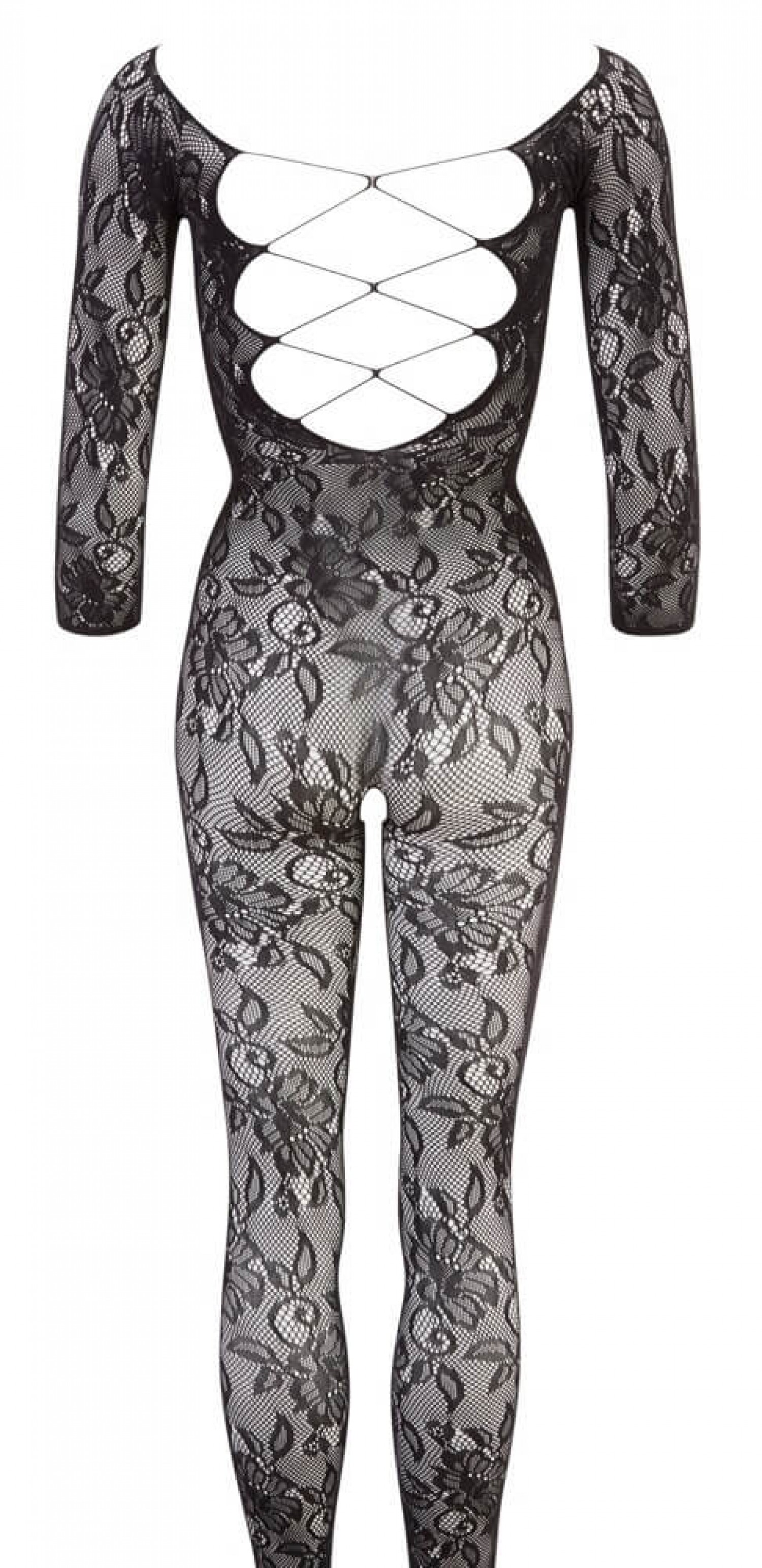 Csodaszép virágmintás csipkéből készült, varrásmentes cicaruha. 3/4-es ujjal, zárt lábrésszel. Hátul szexi, fűzős kivágással, elöl mély dekoltázzsal. Szeméremnél nyitott, aktus közben is viselhető. Fekete színben. Anyaga: 90%Polyamid, 10%Elasthan. Mérete: S-L (egyenméret).