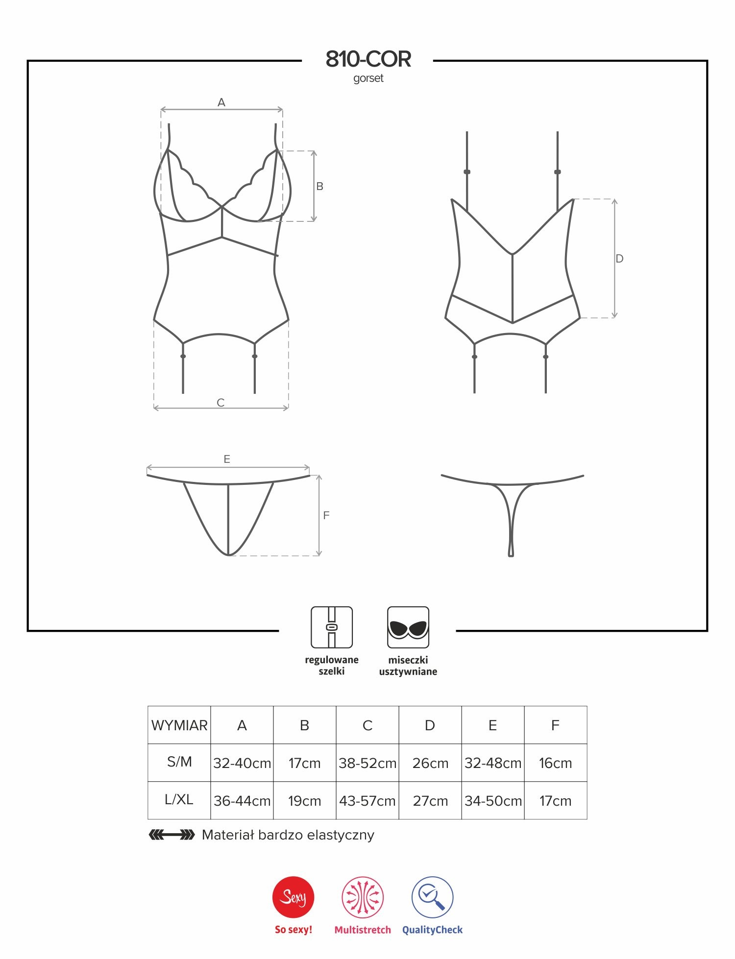 Obsessive 810-COR-1 - csipkés, harisnyatartós felső és tanga fekete színben tökéletes azok számára, akik nem szívesen mutogatják testük minden pontját, de ugyanakkor mégis szeretnének valami csábító és szexi fehérneműt felvenni párjuknak. Ez a corset teljes mértékben takarja a hasadat, hogyha ezt a testrészedet tekinted a legproblémásabbnak, ugyanakkor mégis a csipkéknek és a hátat szabadon hagyó kivágásnak köszönhetően őrülten szexi darab. Testhezálló, rugalmas anyagból készül így viselése nagyon kényelmes és akár egész este rajtad lehet akkor sem fog bevágni sehol. A dekoltázst hangsúlyozó, enyhén bélelt mellrésszel látták el az Obsessive 810-COR-1-et, hogy kebleid még dúsabbnak és szexibbnek hassanak. Vékony vállpántokkal és a 4 db harisnyatartó pánttal könnyedén személyre szabhatod az új fehérneműidet.