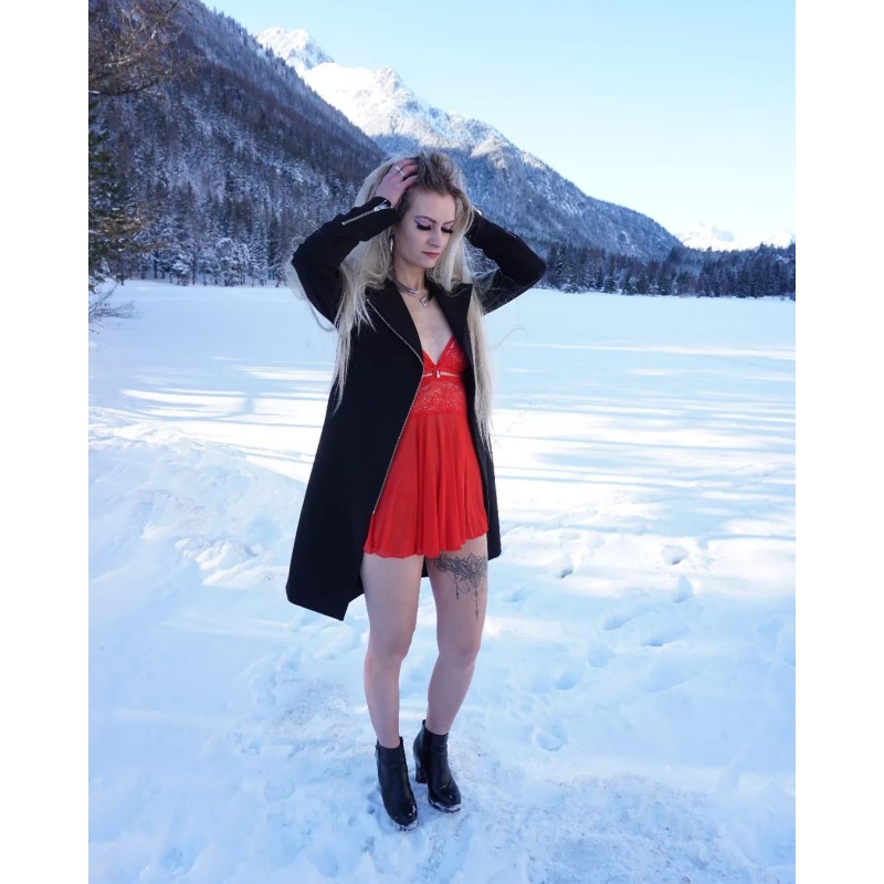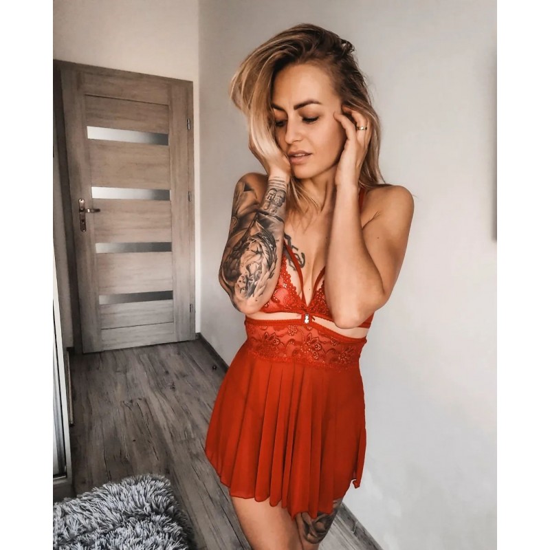 Puha, rugalmas anyagból készülő, kényelmes babydoll, felül pikáns, nyitott részletekkel, alul lenge, A-vonalú fazonban, így a csípőben erősebb Hölgyeken is tökéletesen mutat.