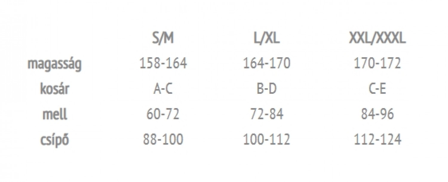A Passion Devil sorozata mára a nevében is hordozza, hogy ördögien szexi darabokból áll. A Leticia csipkés pántos body elöl teljesen nyitott ezért nem sokat hagy a képzeletre ugyanakkor a fűződő Passion feliratos gumi pántok mégis egészen különlegessé varázsolják ezt a szexi fehérneműt. A pántok beállítására apró horgok szolgálnak, bár gumi pántokról van szó mégsem csípnek és kivállóan tartanak. Hátul teljesen zárt 3/4-es ujjú body, amely ritkaság számba megy így elengedhetetlen a szexi fehérnemű kedvelők gardróbjából! Nyűgözd le a párodat, hiszen a látvány magáért beszél. Magas minőségű egyedi szabású termék, amely rendkívül kényelmes is! Szeméremrésze kipatentolható, így bár igen zártnak látszik a fehérnemű, az akció közben nem kell levenni, tehát nyugodt lehetsz az estét nem fogja félbeszakítani!