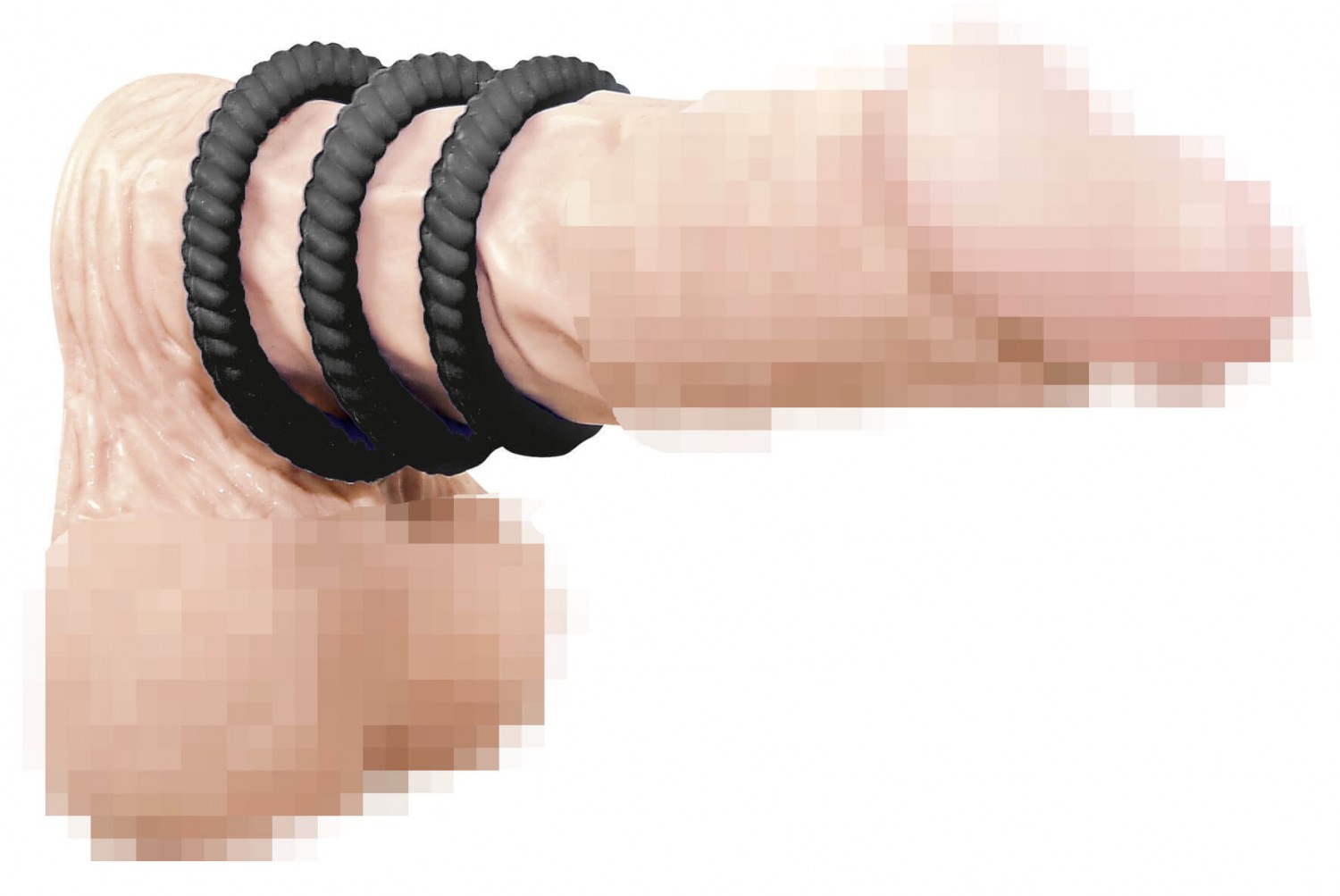 Strapabíró,erős, ugyanakkor rugalmas, fekete szilikonból készült, három részes gyűrűszett. A mindig tökéletesen merev és tartós erekcióért, mindkét fél örömére. Mindhárom gyűrű különleges, barázdált, stimuláló felszínnel készült. Egy 2,6cm, egy 3cm és egy 3,5cm átmérőjű gyűrű a csomagban. A termékek együttesen és külön-külön is használhatóak. Anyaguk: szilikon.