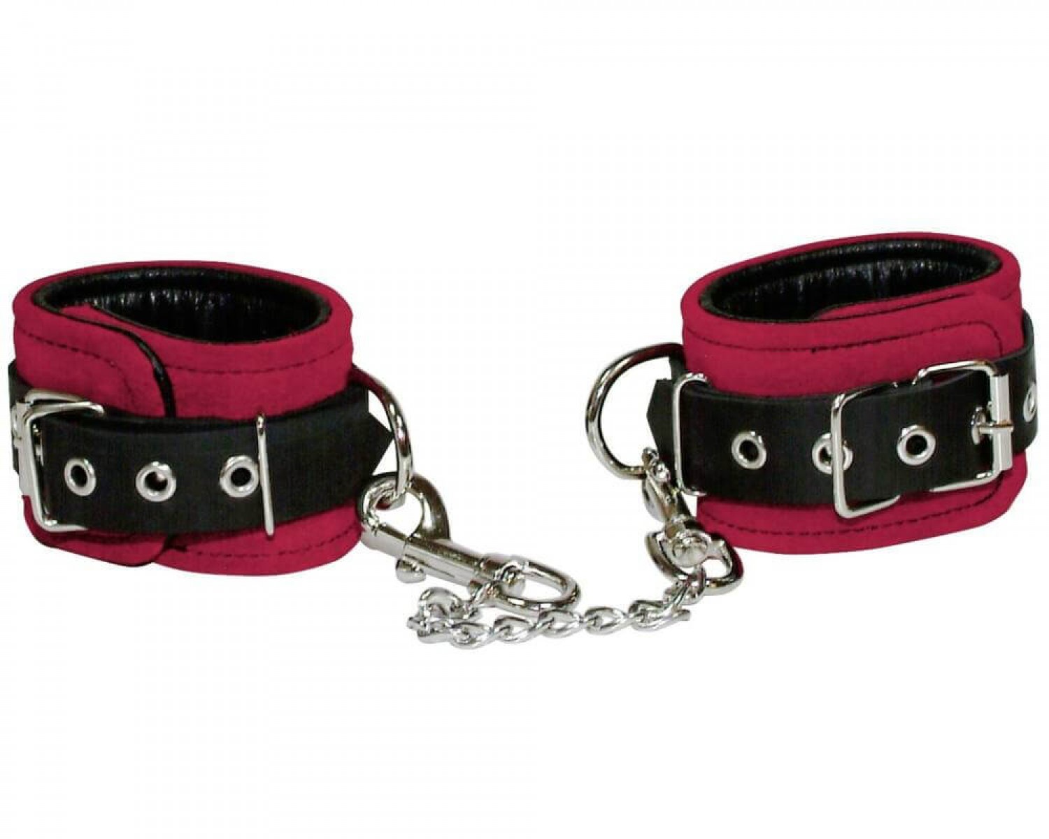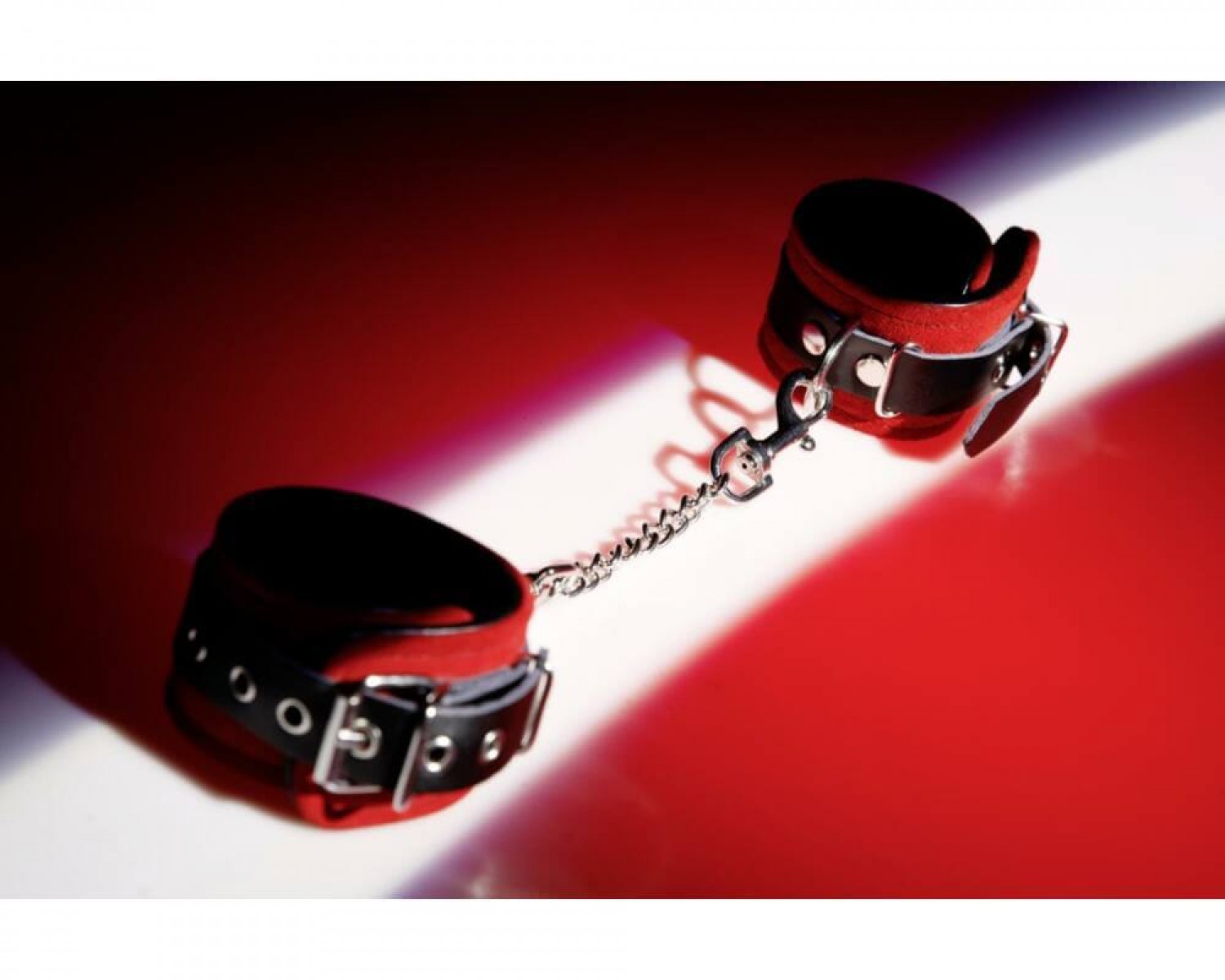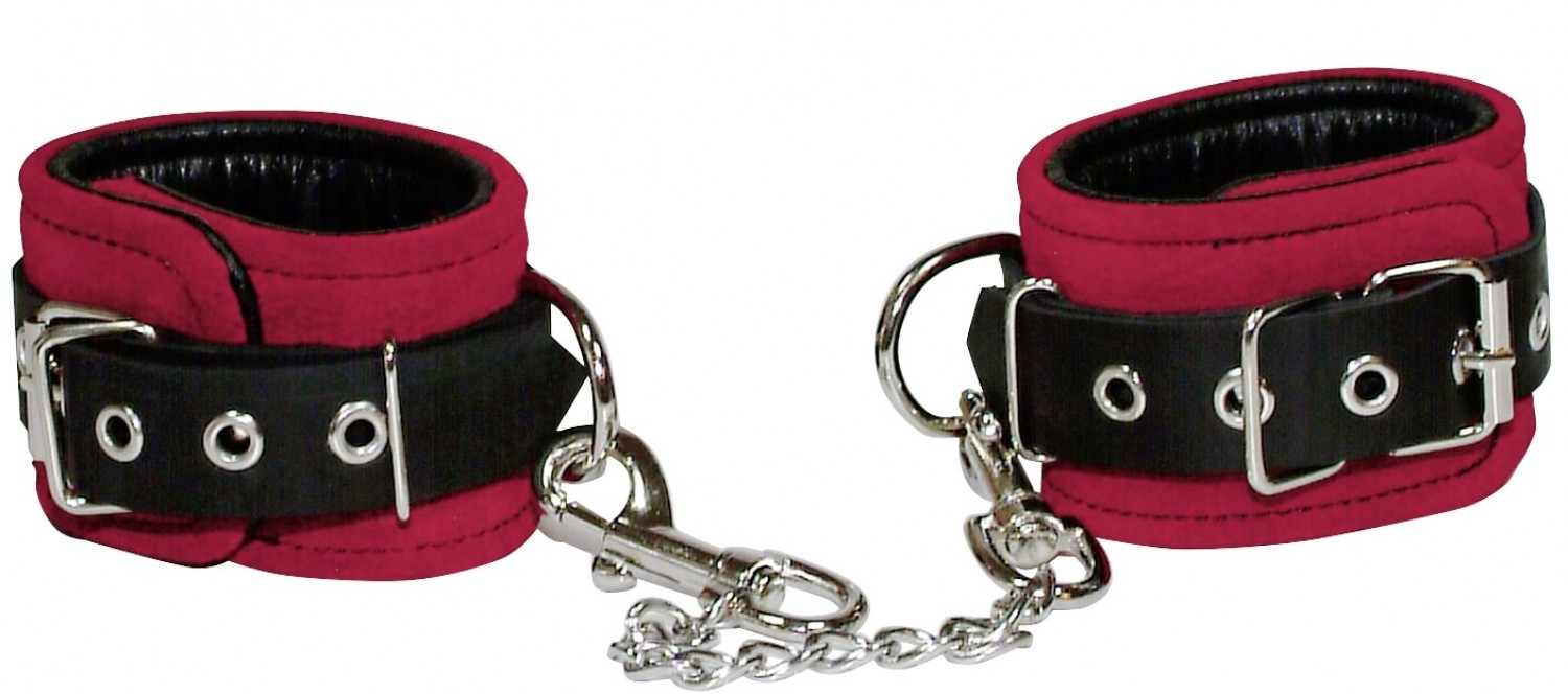 Kiváló anyagok felhasználásával, vörös velúrbőr és valódi, fekete bőr tökéletes kombinációjából készült csuklóbilincsek (1pár), fém D-rögzítőgyűrűkkel. A mandzsetták kb. 5,5cm szélesek, méretük fém csattal állítható. A szett tartalma a nikkelmentes fémből készült, ezüst színű, 24cm hosszú lánc, mindkét végén fém karabinerrel.