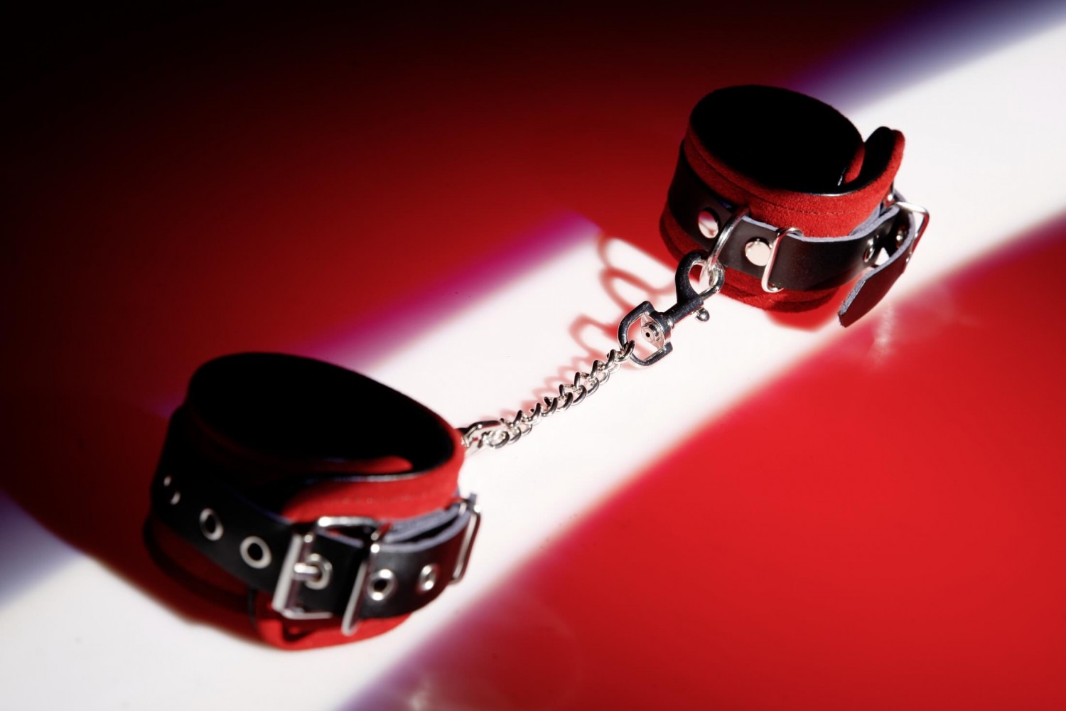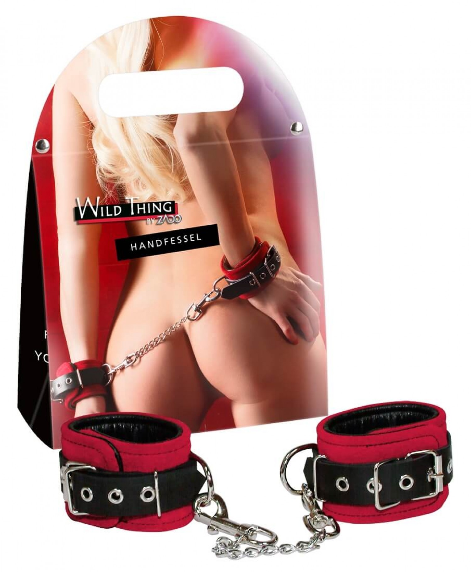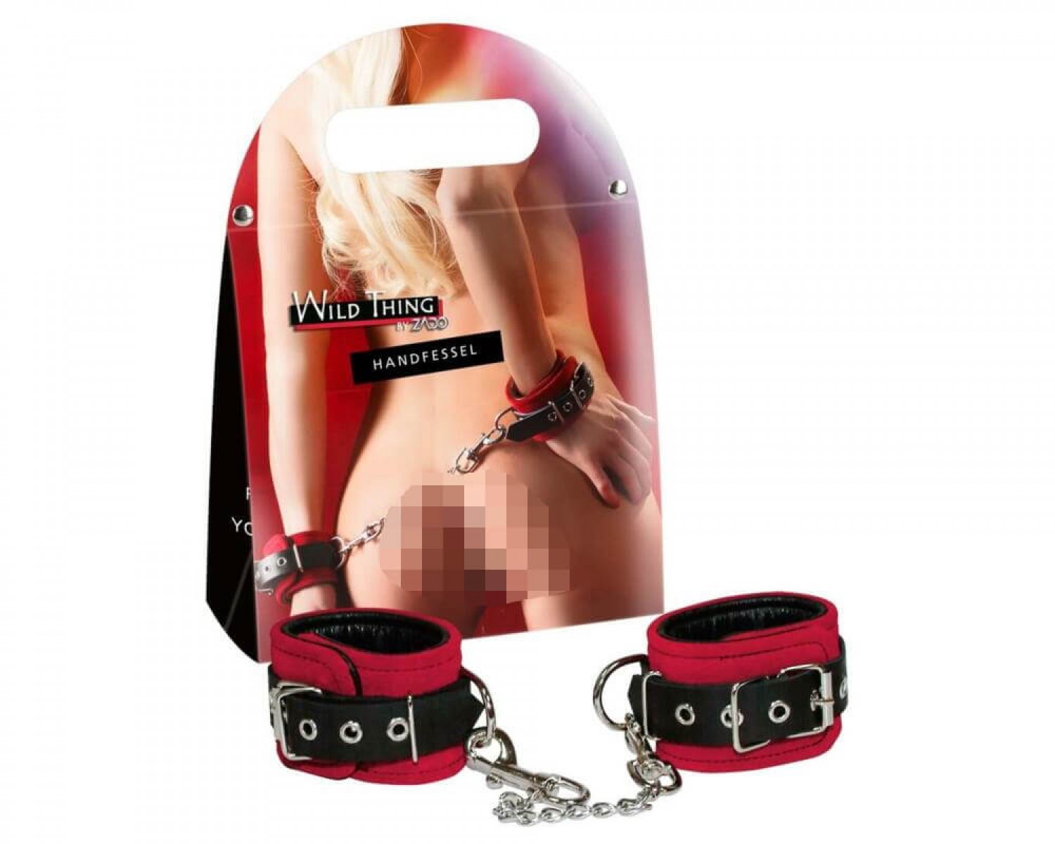 Kiváló anyagok felhasználásával, vörös velúrbőr és valódi, fekete bőr tökéletes kombinációjából készült csuklóbilincsek (1pár), fém D-rögzítőgyűrűkkel. A mandzsetták kb. 5,5cm szélesek, méretük fém csattal állítható. A szett tartalma a nikkelmentes fémből készült, ezüst színű, 24cm hosszú lánc, mindkét végén fém karabinerrel.